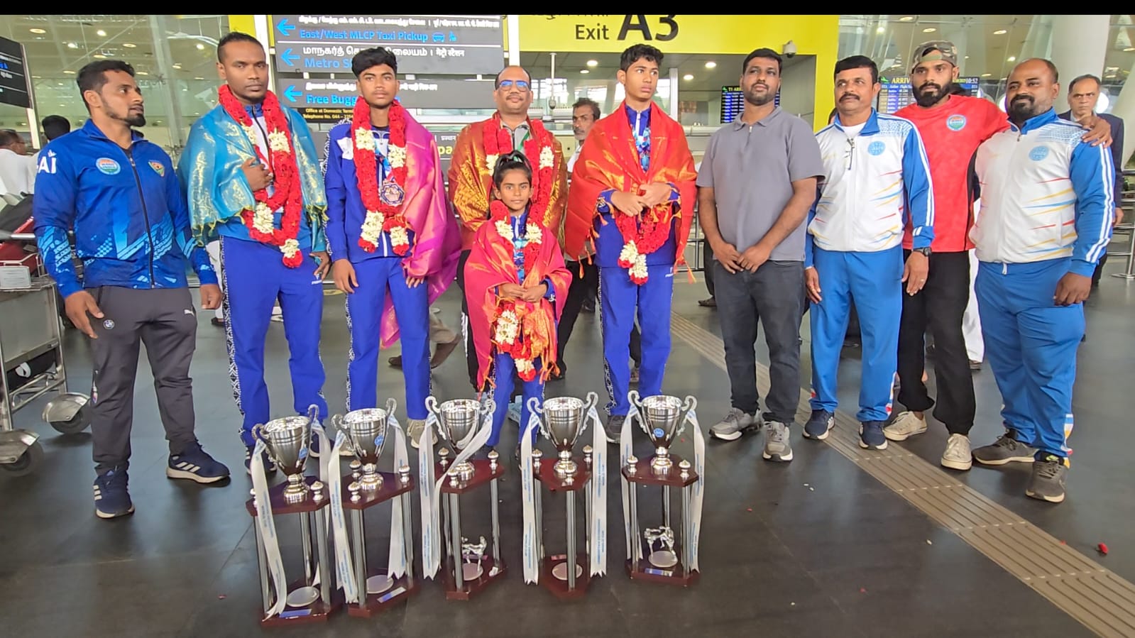 இந்தியா உட்பட 40 நாடுகளைச் சேர்ந்த 2,900 வீரர்கள் பங்கேற்றனர் இப்போட்டியில் இந்தியாவுக்காக விளையாடிய தமிழகத்தை சேர்ந்த வீரர்கள் 5 தங்கம் மற்றும் 2 வெண்கலப் பதக்கங்களை வென்ற நிலையில் இன்று சென்னை விமானத்தில் வந்தனர்,