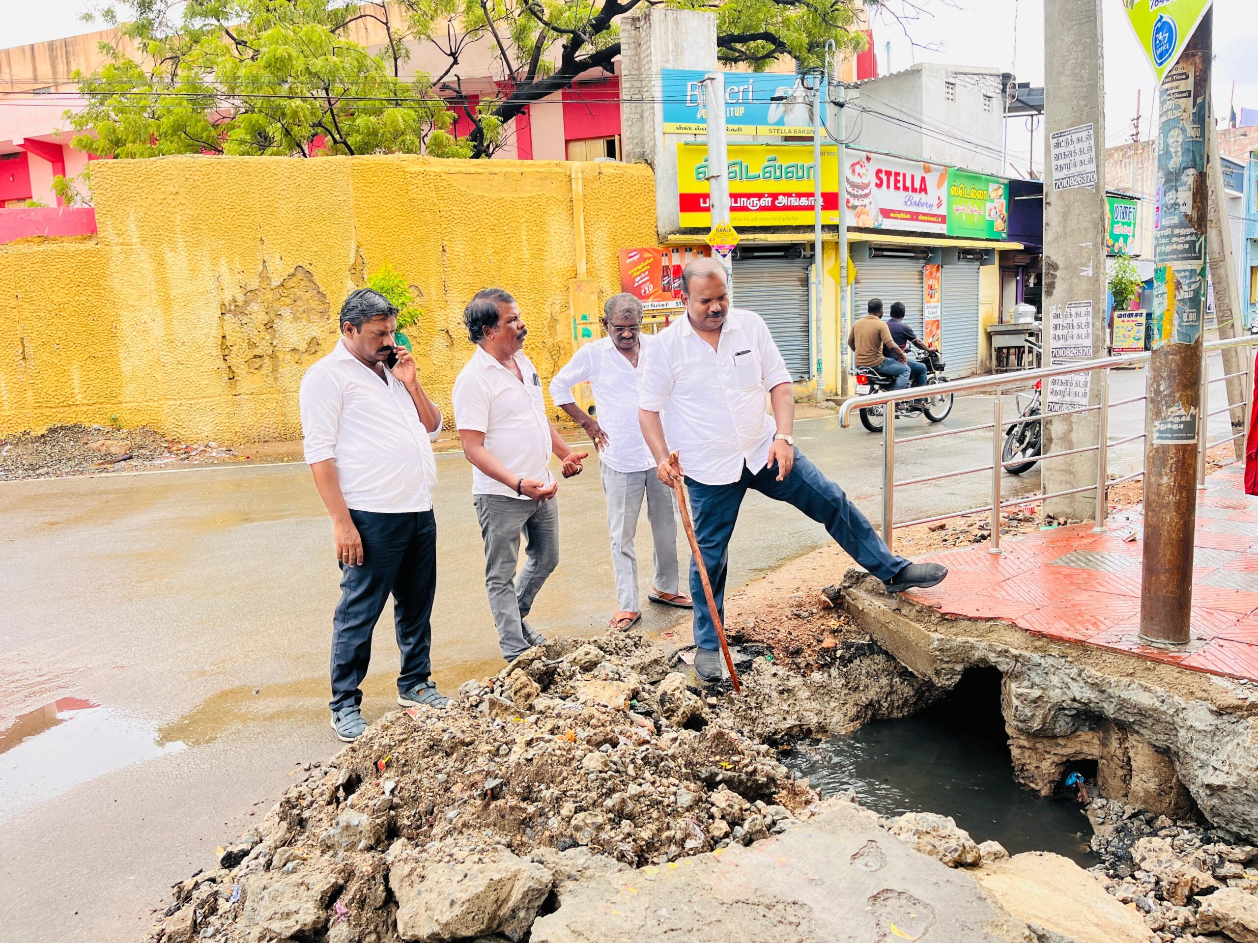 ரயில்வே ஸ்டேஷன் ரோட்டில் காண்களைப் பார்வையிடும்போது மழைநீர் செல்லக்கூடிய தண்ணீர் சரியாக செல்கிறதா? மணல் ஏதும் தேங்கி உள்ளதா என்பதை பார்ப்பதற்காக, அருகில் கிடந்த ஒரு கம்பை எடுத்து கழிவுநீர் செல்லக்கூடிய கானுக்குள் தண்ணீர் செல்லும் வேகம் மற்றும் மணல் உள்ளதா என்று மாநகராட்சி மேயர் ஜெகன் பார்த்தார்.