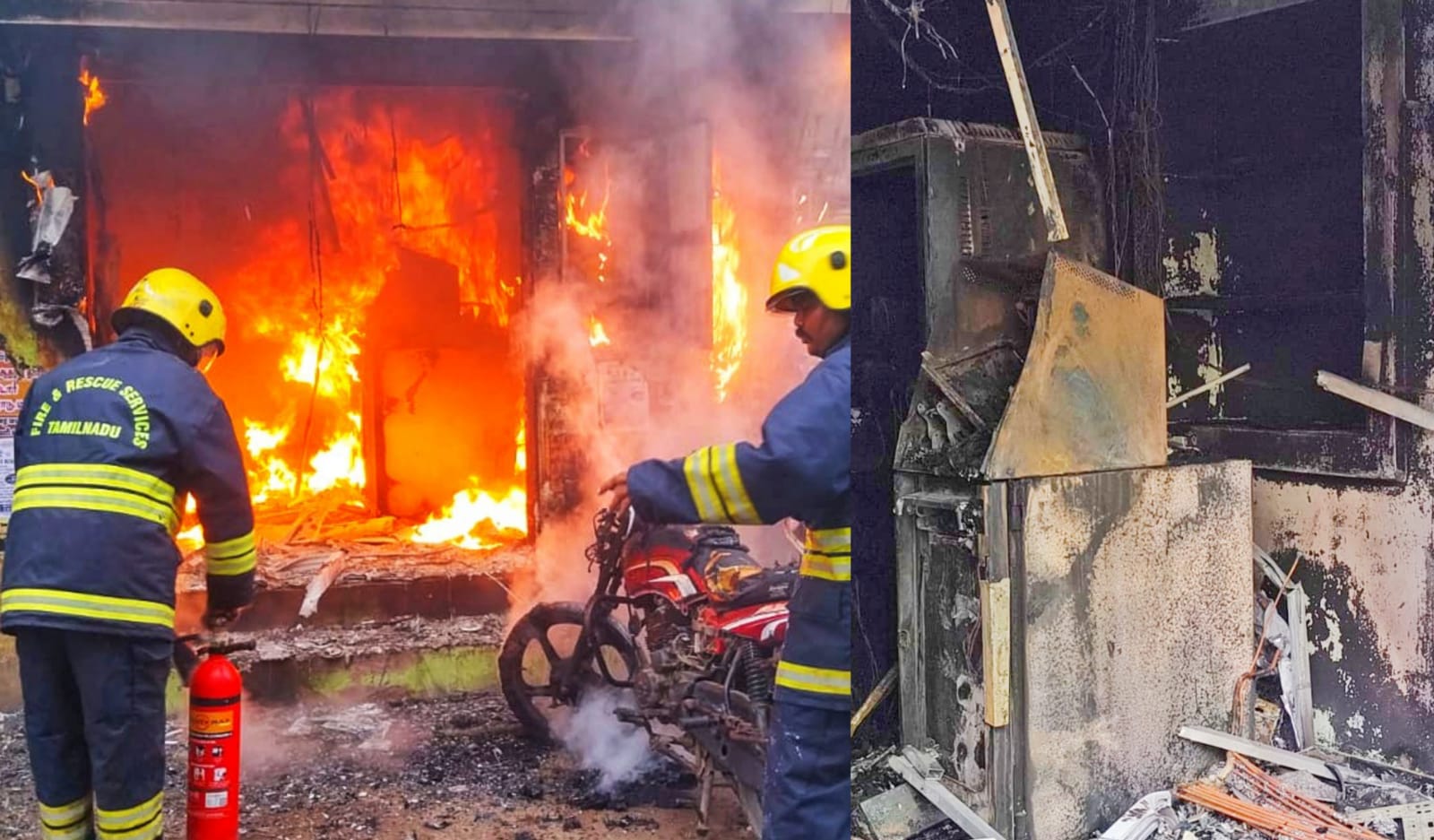 மதுரை அருகே ஏ.டி.எம். மையத்தில் தீவிபத்து!-பல லட்சம் ரூபாய் சேதம்; 5 டூ வீலர்களும் தீயில் கருகின!!