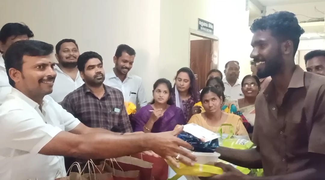 கரூர் மாவட்டம் புகலூர் நகராட்சி தலைவராக செயல்பட்டு வருபவர் சேகர் என்கிற குணசேகரன் புகலூர் நகராட்சி அலுவலகத்தில் நகராட்சியில் பணியாற்றக்கூடிய தூய்மை பணியாளர்கள் சுமார் 200 பேருக்கும், நகராட்சியில் பணியாற்றக்கூடிய அலுவலர்களுக்கும் வேஷ்டி, சேலை சட்டை இனிப்பு, காரம் மற்றும் ரொக்கம் பரிசு வழங்கி தீபாவளி திருநாள் நல்வாழ்த்துக்கள் தெரிவித்தார்.