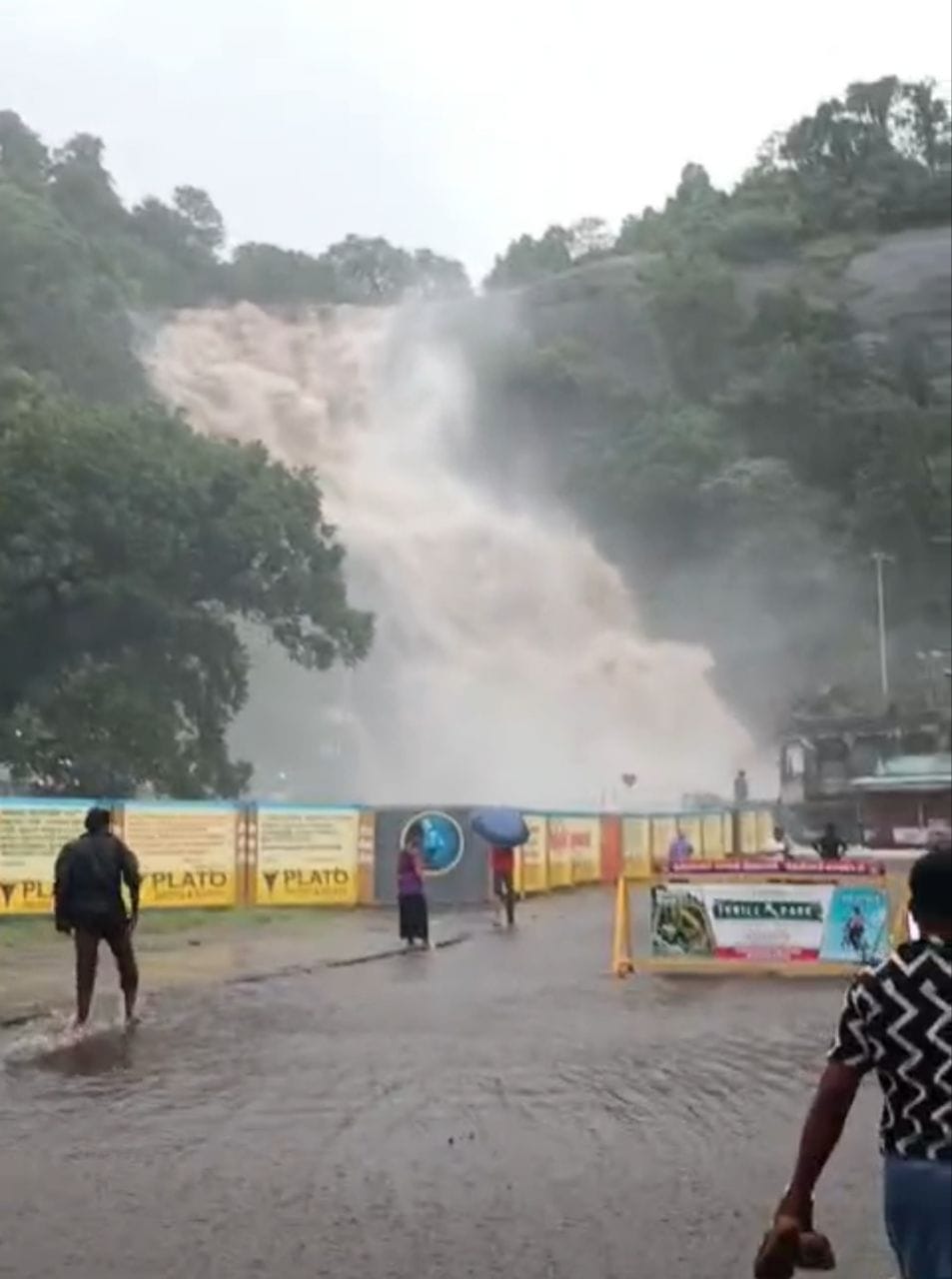 அதன் படி கடந்த சில நாட்களாக பலத்த மழை பெய்தது. சாலைகளில் எதிரில் வந்த வாகனங்கள் கூட தெரி யாத அளவிற்கு வெளிச்சம் குறைவாக இருந்தது. பெரும்பாலான வாகனங்கள் பகல் வேளையிலேயே முகப்பு விளக்கை எரிய விட்டவாறு இயக்கப்பட்டடன. தொடர்ந்து பெய்த பலத்த மழையினால் அனைத்து அருவிகளிலும் காற்றாற்று வெள்ளம் போல் தண்ணீர் விழுகிறது.