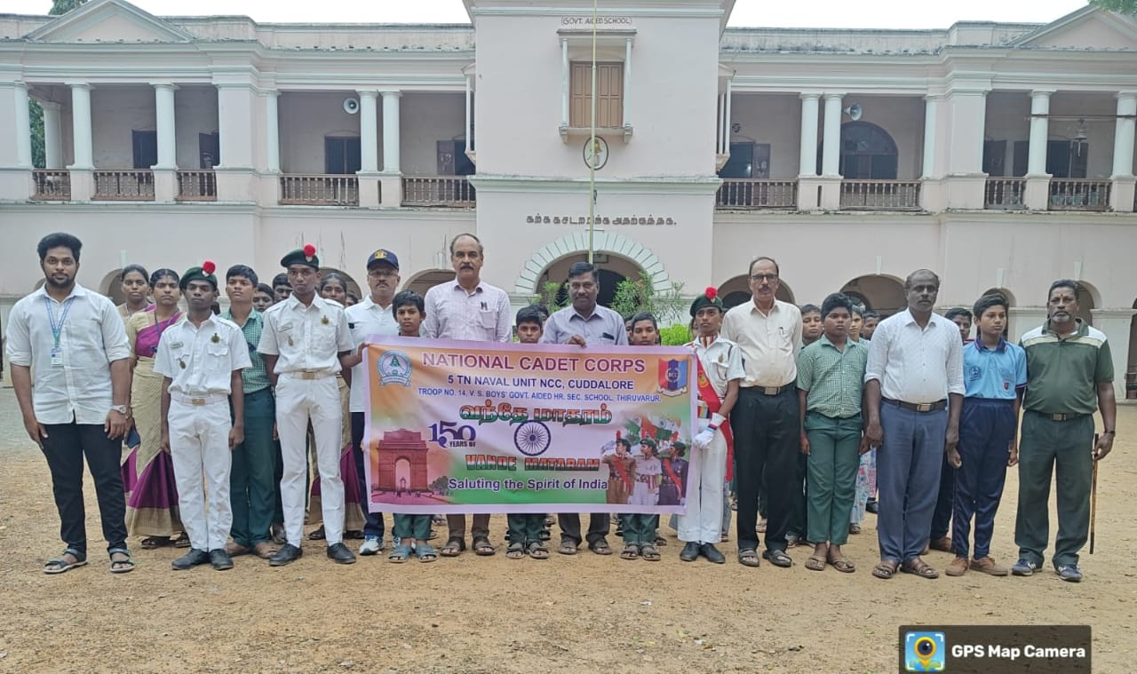 இந்திய கலாச்சார அமைச்சகம் கூறிய வண்ணம் கடலூரை மையமாக கொண்ட ஐந்தாம் எண் தமிழ்நாடு கப்பற்படை பிரிவு கமாண்டர் செந்தூர்சன் வழிகாட்டுதல் படி இந்திய விடுதலை போராட்டத்தில் இந்தியாவில் உள்ள மக்களுக்கு தேசபக்தியை ஊட்டியதுடன் உணர்ச்சி மிக்க பாடலாகவும், ஒற்றுமை மற்றும் ஒருமைப்பாட்டிற்கு வலிமை சேர்ப்பதாகவும் விளங்கிய வந்தே மாதரம் பாடலைப் பாடி நம் இந்தியத் தாய்த்திருநாட்டிற்கு பெருமை சேர்க்கும். நிகழ்வானது திருவாரூர் வ.சோ.ஆண்கள் அரசு உதவி பெறும் மேல்நிலைப் பள்ளியில் செயல்பட்டு வரும் தேசிய மாணவர் படை கப்பல் படை பிரிவு மாணவர்கள் சார்பில் நடைபெற்றது.