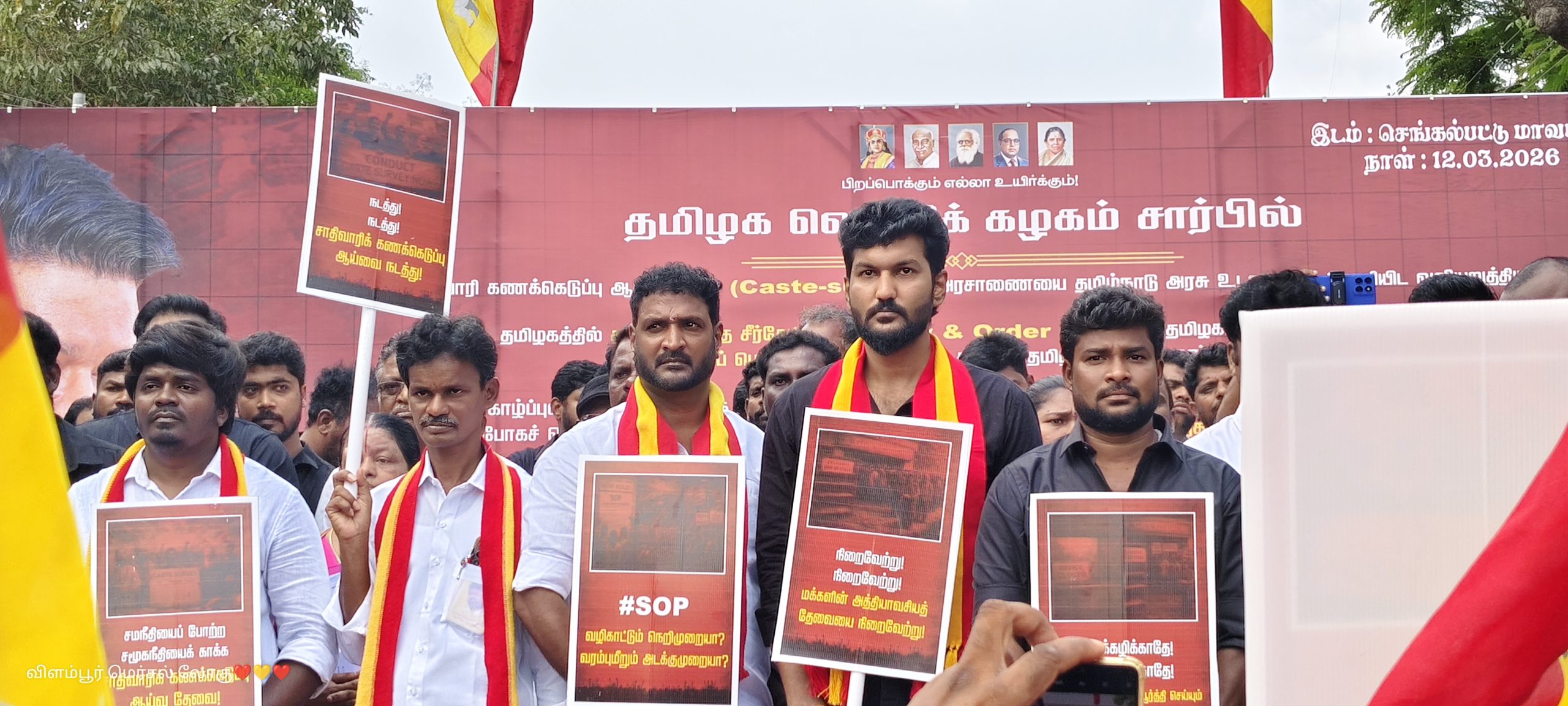 தமிழக வெற்றிக் கழகம் செங்கல்பட்டு ஒருங்கிணைந்த மாவட்டம் சார்பில் மாபெரும் கண்டன ஆர்ப்பாட்டம் நடை பெற்றது தமிழ்நாடு அரசு சாதிவாரி கணக்கெடுப்பதற்கான அரசாணையை உடனடியாக வெளியிட வலியுறுத்தியும், தமிழகத்தில் சீர்குலைந்து வரும் சட்டம் ஒழுங்கு மற்றும் பெருகிவரும் போதை பொருள் புழக்கத்தை தடுக்க தவறிய திமுக அரசை வன்மையாக கண்டித்தும் செங்கல்பட்டு பழைய பேருந்து நிலையம் அருகில் செங்கல்பட்டு தெற்கு (கிழக்கு) மாவட்ட கழக செயலாளர் எம்.ஜி.கே.மோகன் ராஜா அவர்களின் தலைமையில் நிர்வாகிகள் கலந்து கொண்டார்கள்.