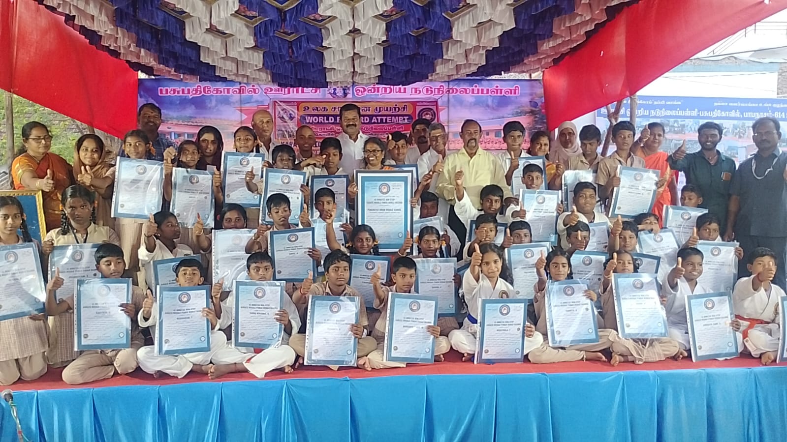 கராத்தேவில் புதிய சாதனையாக உலக சாதனை படைத்த அரசு பள்ளி மாணவ மாணவிகளுக்கு ஆல் இந்தியா உலக சாதனையாளர் தலைவர் வெங்கடேசன் கலந்துகொண்டு ஆல் இந்தியா உலக சாதனையாளர் விருது சான்றிதழ் வழங்கி கௌரவிக்கப்பட்டது.