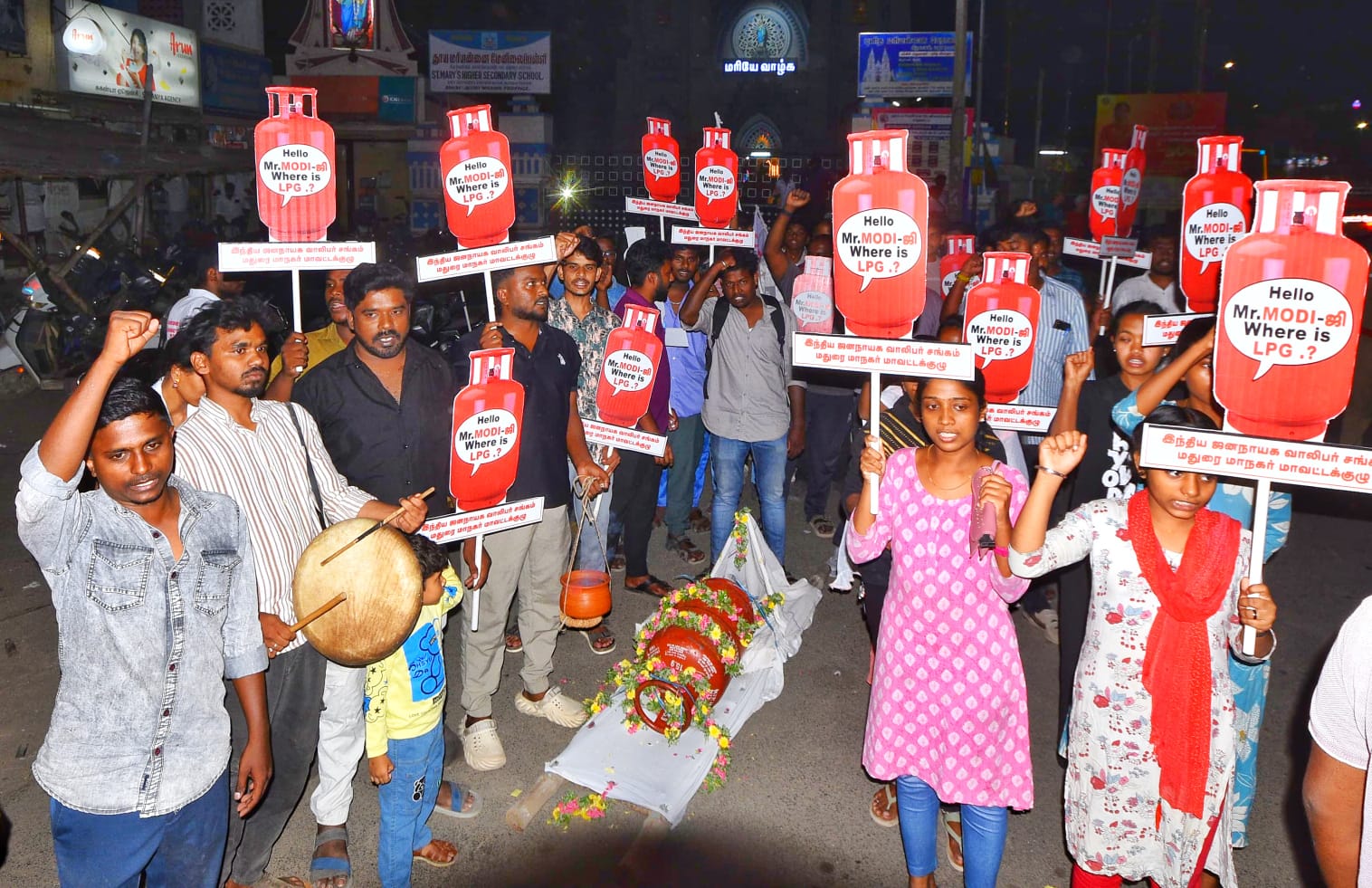 முனிச்சாலை தினமணி டாக்கீஸ் அருகில் தொடங்கிய இந்த போராட்டத்தில், கேஸ் சிலிண்டருக்கு பாடை கட்டி ‘இறுதி ஊர்வலம்’ போல எடுத்துச் செல்லும் விதத்தில் நூதன போராட்டம் நடந்தது.