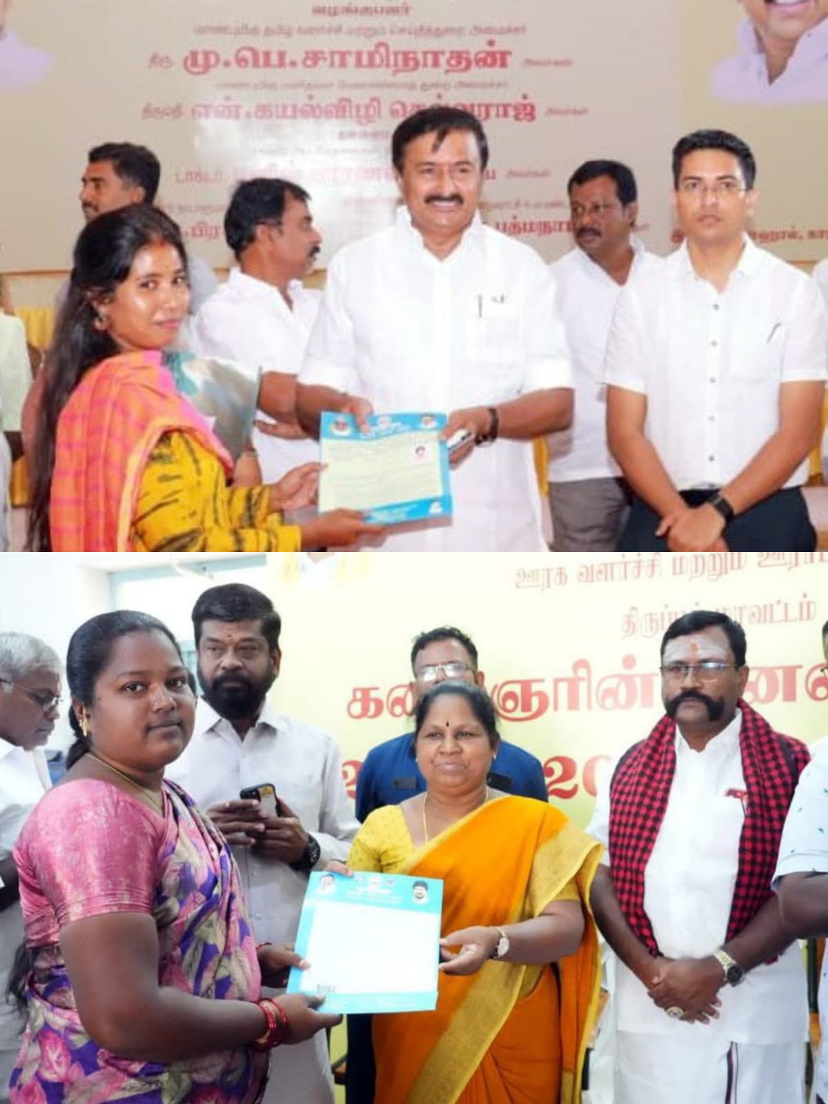 காங்கயம் மற்றும் திருப்பூர் மாவட்டப் பகுதியில் சனிக்கிழமை நடைபெற்ற நிகழ்ச்சிகளில் 834 பயனாளிகளுக்கு கலைஞரின் கனவு இல்ல திட்டப் பணிகளுக்கான ஆணைகளை அமைச்சர்கள் மு.பெ.சாமிநாதன், என்.கயல்விழி செல்வராஜ் ஆகியோர் வழங்கினர்.