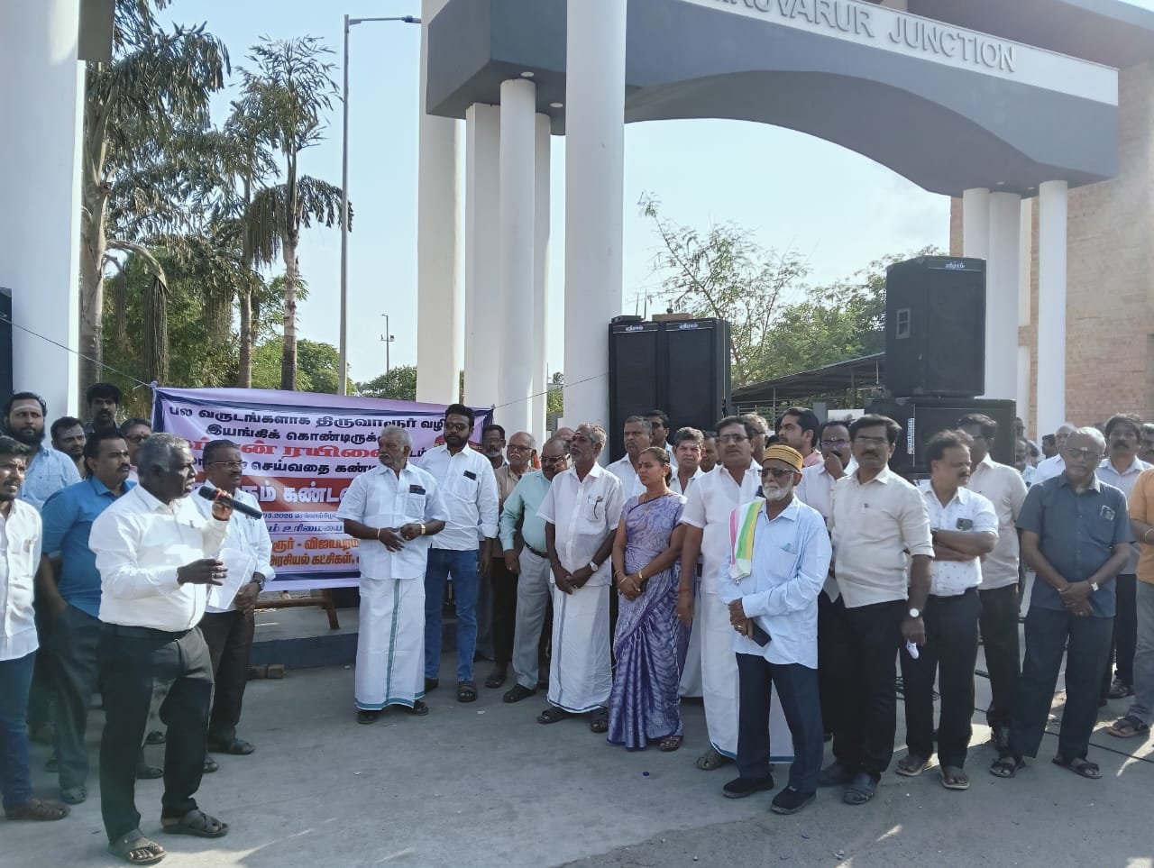 திருவாரூர் ரயில் நிலைய நுழைவாயில் முன்பு, பிளாட்டினம் விழா கண்ட திருவாரூர் விஜயபுரம் வர்த்தகர் சங்க தலைவர் CA, பாலமுருகன் தலைமையில் மாபெரும் கண்டன ஆர்ப்பாட்டம் நடைபெற்றது,