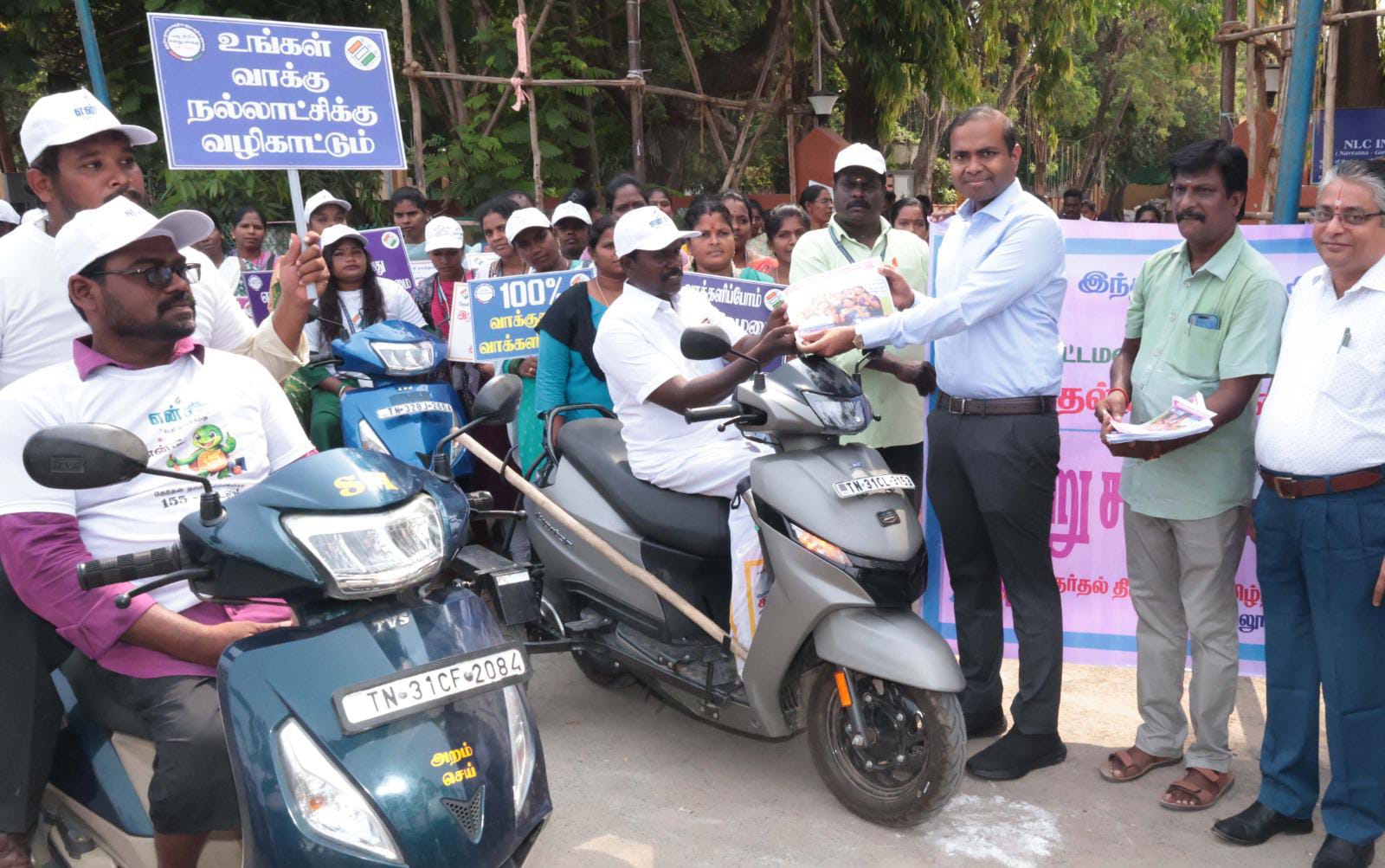 100 சதவீதம் வாக்குப்பதிவினை வலியுறுத்தும் வகையில் வாக்கு செலுத்துவது ஒவ்வொருவரின் கடமை, உங்கள் வாக்கு சமூக மாற்றத்தின் விதை,நம் வாக்கு நமது உரிமை,என் வாக்கு என் கடமை போன்ற விழிப்புணர்வு வாசகங்கள் அடங்கிய பதாகைகளை ஏந்திய வண்ணம் மாற்றுத்திறனாளிகள் பங்கேற்ற மூன்று சக்கர வாகன பேரணி தொடங்கிவைக்கப்பட்டது. இவ்வாகன பேரணி கடலூர் நகர அரங்கம் முதல் உழவர் சந்தை வரை வாக்காளர்களுக்கு விழிப்புணர்வு ஏற்படுத்தும் வகையில் நடைபெற்றது.