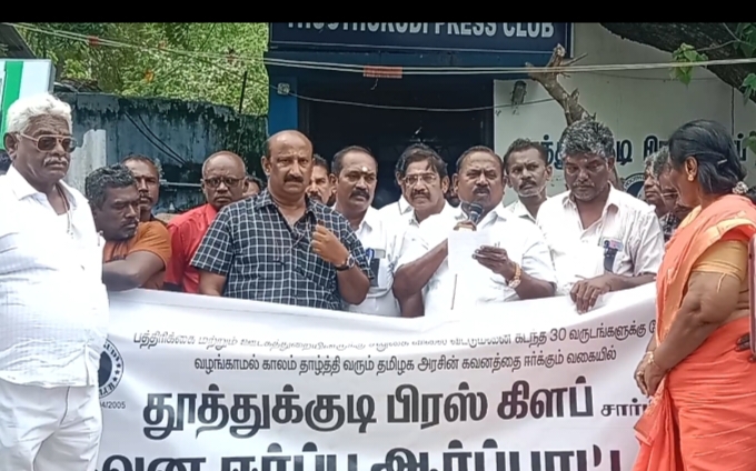 தூத்துக்குடி பத்திரிகையாளர் கவன ஈர்ப்பு ஆர்ப்பாட்டம். தூத்துக்குடி பத்திரிக்கையாளர் சுமார் 30 ஆண்டுகால நீண்ட நாள் கோரிக்கை சலுகை விலை விட்டு மணை வழங்கப்படாததை கண்டித்து தமிழக அரசு மற்றும் மாவட்ட நிர்வாகத்தின் கவனத்தை ஈர்க்கும் வகையில் தூத்துக்குடி பிரஸ் கிளப் முன்பு ஆர்ப்பாட்டம் நடைபெற்றது இந்நிகழ்ச்சியில் தூத்துக்குடி அ.தி.மு.க வர்த்தக அணிகழக சார்பாக முன்னால் அமைச்சர் சி.த. செல்லப்பாண்டியன் கலந்து கொண்டவர் சிறப்பு ஆற்றினார்.