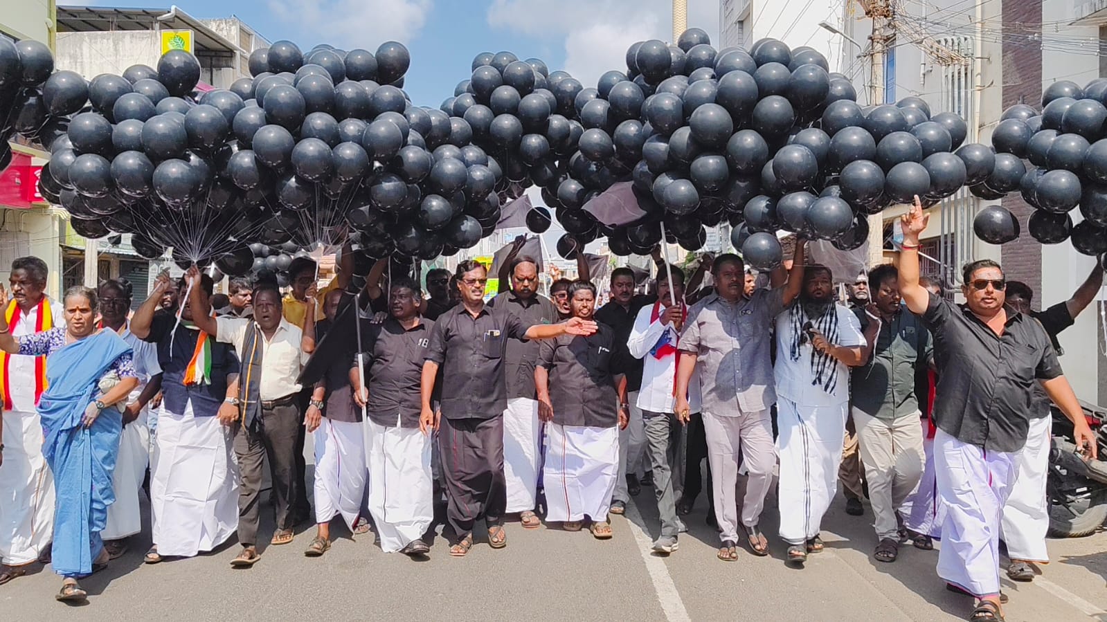கும்பகோணத்தில் சட்டமன்ற உறுப்பினர் அன்பழகன் தலைமையில் நூற்றுக்கணக்கான திமுக மற்றும் தோழமைக் கட்சியினர் ஒன்று கூடி கருப்பு சட்டை, கருப்பு கொடி ,1000 கருப்பு பலூன்கள், என எங்கும் கருப்பு மயமாக ஊர்வலமாகச் சென்று ஆயிரத்துக்கும் மேற்பட்ட கருப்பு பலூன்களை பறக்க விட்டனர்.