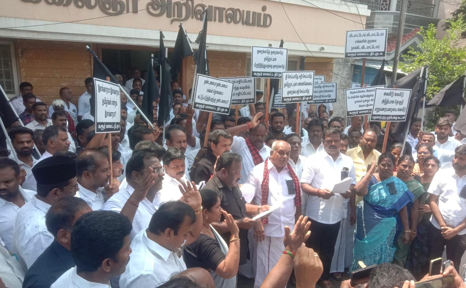 கரூர் மாவட்ட திமுக மாவட்டசெயலாளரும்,மேற்கு மண்டல பொறுப்பாளருமான வி.செந்தில் பாலாஜி தலைமையில் கரூர் கலைஞர் அறிவாலயம் முன்பு கருப்புக்கொடி ஏற்றியும், மசோதா நகலை எரித்தும், கோஷங்கள் எழுப்பியும் தங்களது வன்மையான கண்டனத்தை தெரிவித்தனர்.