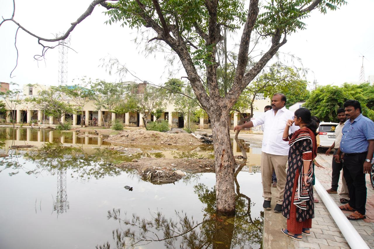 கடந்த ஒரு வார காலத்திற்கு முன்பு தூத்துக்குடி மாநகரில் பெய்த கனமழையின் காரணமாக சி.வ.. அரசு பள்ளியில் மழை நீர் தேங்கியிருப்பதாக மாநகராட்சி மேயர் ஜெகனுக்கு புகார் தெரிவிக்கப்பட்டதை அடுத்து பள்ளி வளாகத்தை நேரில் பார்வையிடுவதற்காக மாநகராட்சி மேயர் ஜெகன் மாநகராட்சி ஆணையர் பிரியங்கா ஆகியோர் சி.வ. அரசு பள்ளியில் தேங்கியுள்ள மழை நீரை பார்வையிட்டனர்