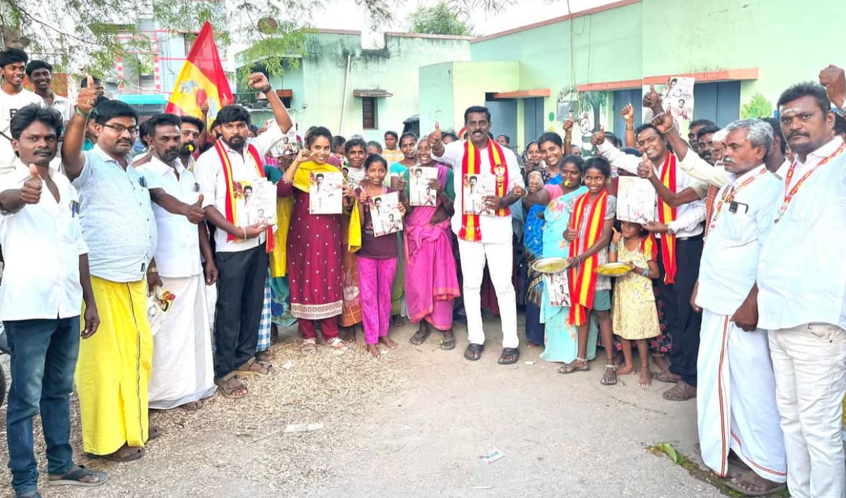 தமிழக வெற்றி கழக வேட்பாளர் பிரகாஷ் உடன் தமிழக வெற்றி கழக நிர்வாகிகள் பலர் உடன் இருந்தனர்.