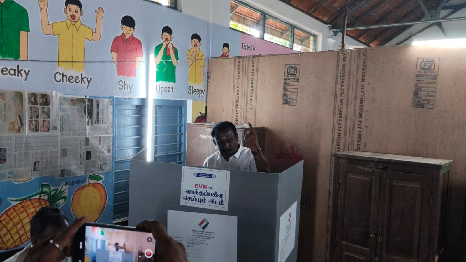 நாமக்கல் மாவட்டம் பரமத்தி வேலூர் சட்டமன்ற தொகுதி அதிமுக வேட்பாளர் சேகர் அவரது சொந்த ஊரான கோப்பனம்பாளையத்தில் உள்ள ஊராட்சி ஒன்றிய தொடக்கப்பள்ளி வாக்குச்சாவடியில் தனது ஜனநாயக கடமையான வாக்கை செலுத்தினார்.