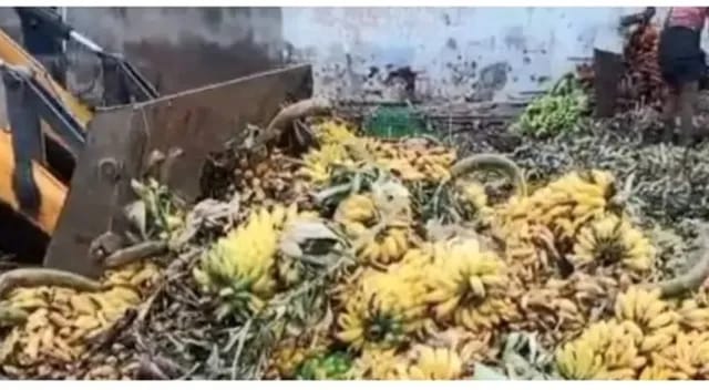 திருச்சி காந்தி மார்க்கெட் வாழைக்காய் மண்டியில் கடந்த சில நாட்களாக வாழைத்தார்களின் வரத்து வழக்கத்தை விட அதிகமாக உள்ளது. பொதுவாக ஒரு நாளைக்கு சுமார் 10 ஆயிரம் வாழைத்தார்கள் வரும் நிலையில், தற்போது 15 ஆயிரம் வாழைத்தார்கள் வந்துள்ளன. இதனால் விற்பனை குறைந்து, வாழைத்தார்கள் வீணாகும் நிலை ஏற்பட்டுள்ளதாக வியாபாரிகள் கவலை தெரிவித்துள்ளனர்.