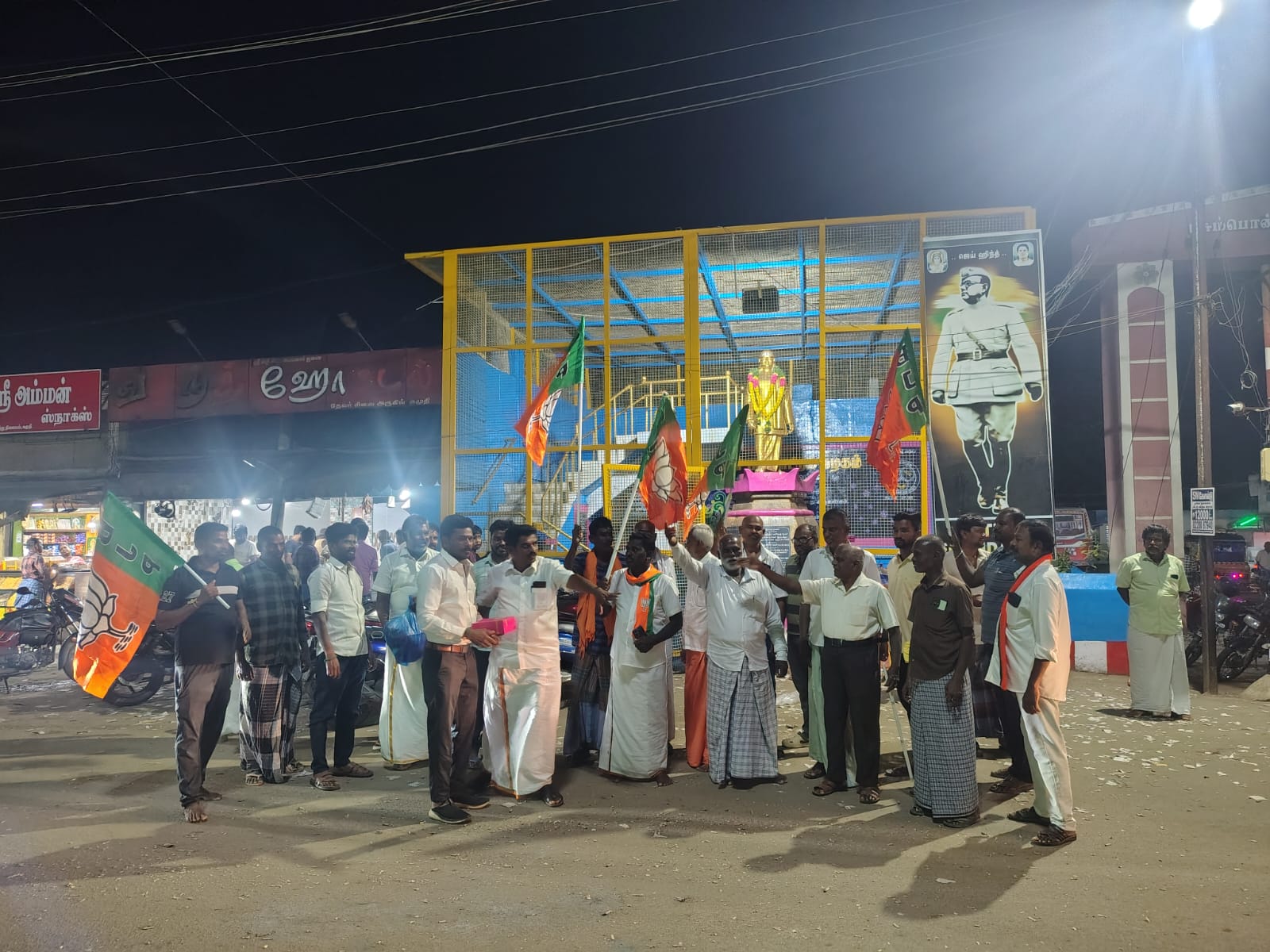 கமுதியில் பாஜக வெற்றிகொண்டாட்டம் பீஹார் மாநிலத்தில் தேசிய ஜனநாயக கூட்டணி மாபெரும் வெற்றி பெற்றுள்ளதை தொடர்ந்து பாரத பிரதமர் நரேந்திர மோடி தேசிய ஜனநாயக கூட்டணி கட்சிக்கு வாக்களித்து வெற்றி அடைய செய்துள்ளனர் அந்த வெற்றியை கொண்டாடும் வகையில் தமிழகத்தில் ராமநாதபுரம் மாவட்டத்தில் கமுதி தெற்கு ஒன்றியம் பாஜக சார்பாக பட்டாசு வெடித்து பொது மக்களுக்கு இனிப்புகள் வழங்கி கொண்டாடினார்கள்