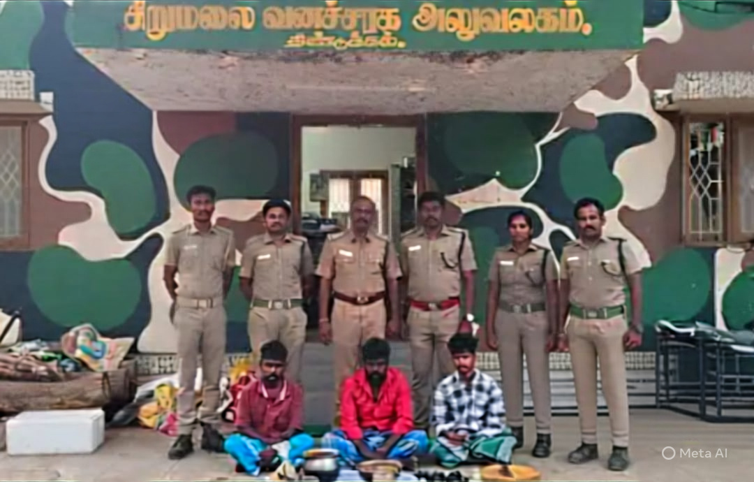 சிறுமலையில் கேளை ஆடு வேட்டையாடிய 3 பேர் கைது – 2 நாட்டு துப்பாக்கிகள், கேளை ஆடு இறைச்சி பறிமுதல்