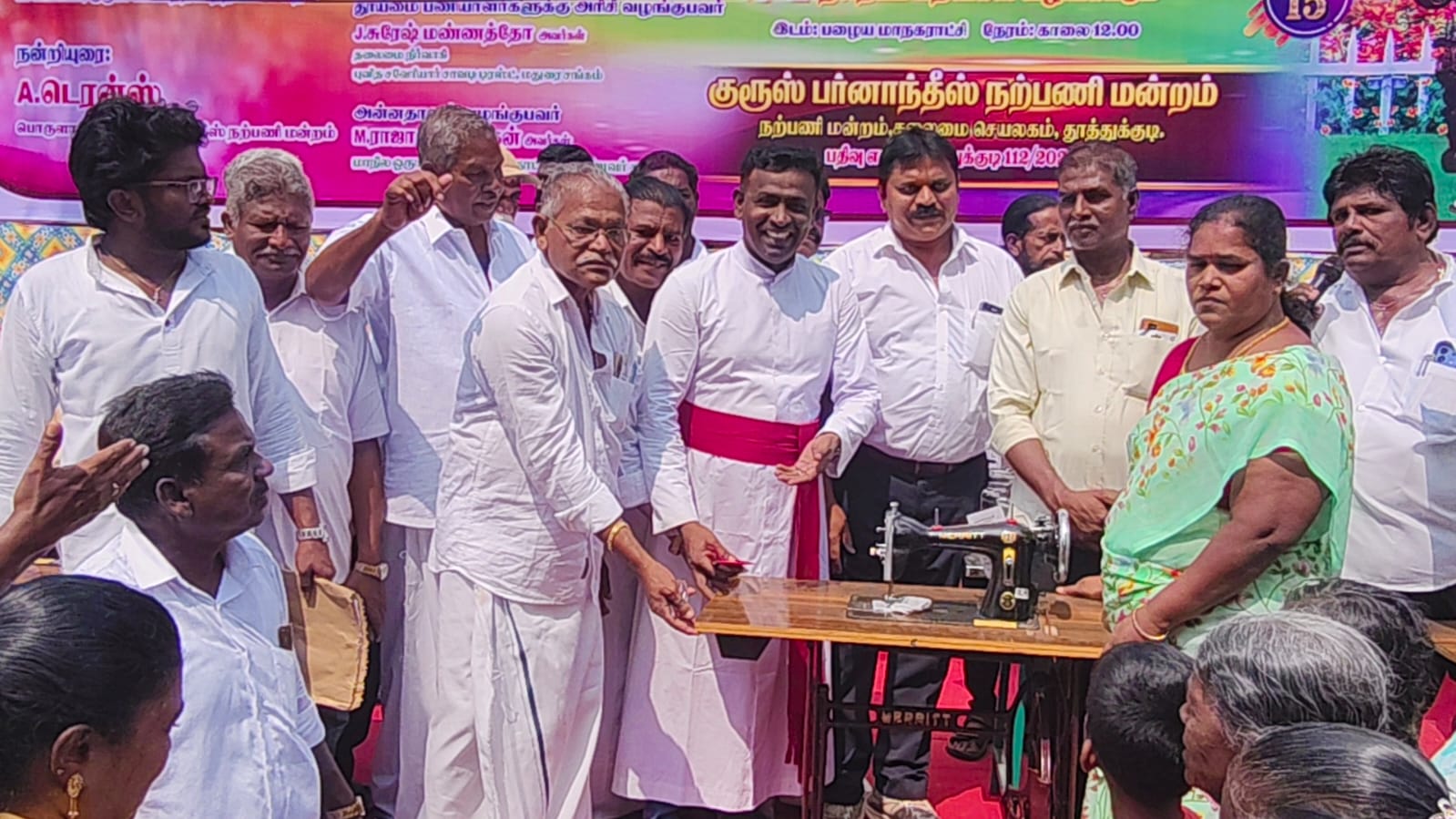 10 ஏழைப் பெண்களுக்கு ஏரல் அருட்பணியாளர் ரவிந்திரன் அடிகளார் தையல் இயந்திரங்களை வழங்கினார் நூறு தூய்மைப் பணியாளர்களுக்கு அரிசி பையை மதுரை புனித சவேரியார் சாவடி டிரஸ்ட் தலைவர் சுரேஷ் மண்ணத்தோ வழங்கினார்.
