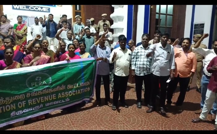 திருவாரூரில் வருவாய்துறை சங்கங்களின் கூட்டமைப்பு சார்பாக சிறப்பு வாக்காளர் பட்டியல் சீர்திருத்தப் பணி குறித்து பல்வேறு கோரிக்கைகளை வலியுறுத்தி மாவட்ட ஆட்சியர் அலுவலகம் முன்பு ஆர்ப்பாட்டம் நடைபெற்றது.