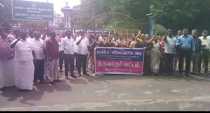 பழைய ஓய்வூதிய திட்டத்தை மீண்டும் அமல்படுத்த வேண்டும் உள்ளிட்ட கோரிக்கைகளை வலியுறுத்தி ஜாக்டோ ஜியோ அமைப்பினர் திருவாரூரில் அடையாள வேலை நிறுத்தம் செய்து ஆர்ப்பாட்டத்தில் ஈடுபட்டனர்.