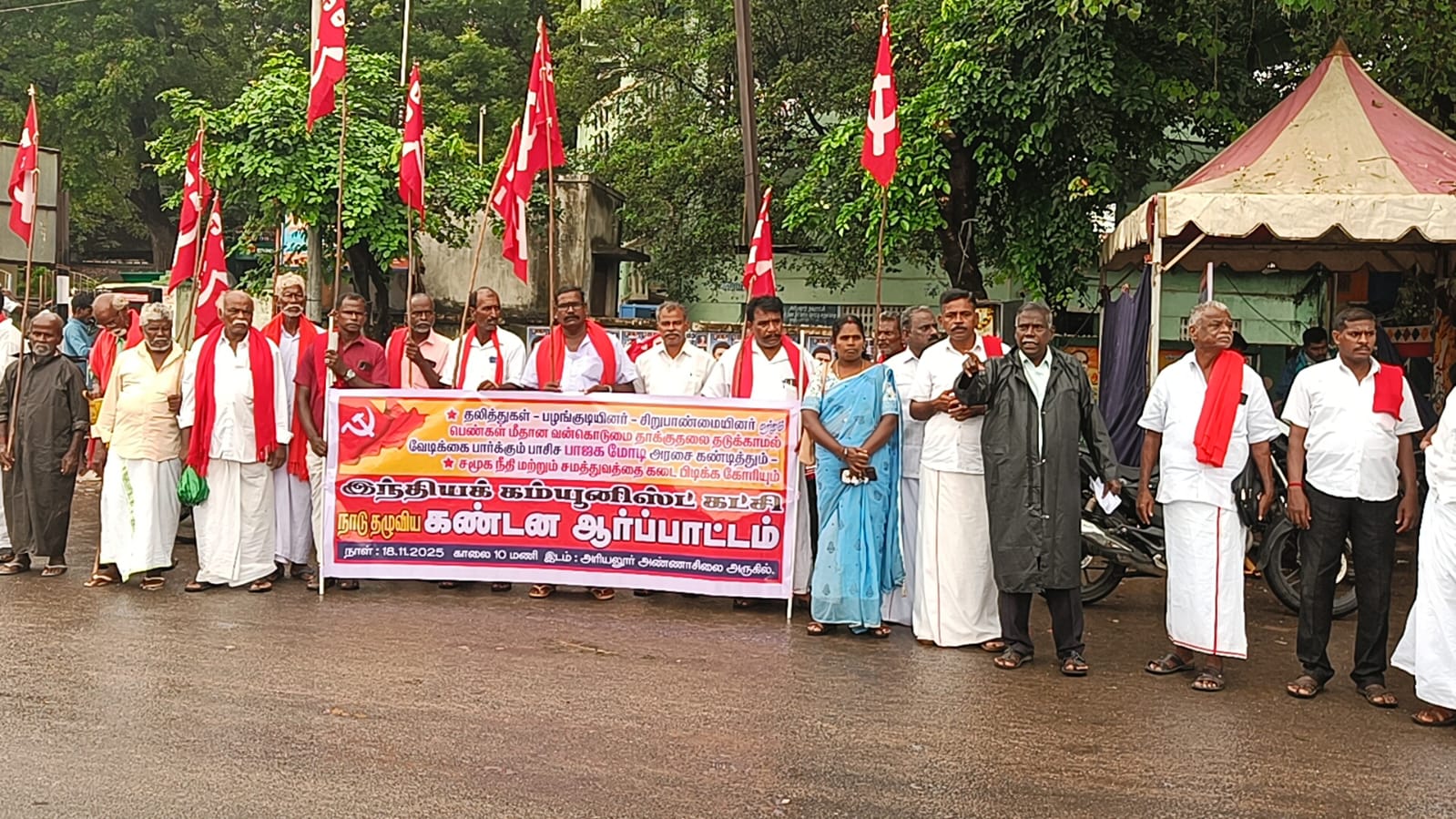 அரியலூரில் நடந்தது இந்திய கம்யூனிஸ்ட் கட்சி சார்பில் அண்ணா சிலை அருகில் கண்டன ஆர்ப்பாட்டம் நடந்தது கட்சியின் மாவட்ட செயலாளர் கே நடராஜன் தலைமை தாங்கினார் மாநில கட்டுப்பாட்டு குழு உறுப்பினர் டி தண்டபாணி முன்னிலை வகித்தார் சமூக நீதி மற்றும் சமத்துவ நாளை முன்னிட்டு இந்த ஆர்ப்பாட்டம் நடந்தது முன்னாள் மாவட்ட செயலாளர் இரா உலகநாதன் ராமநாதன் மாவட்ட பொருளாளர் ஆறுமுகம் அரியலூர் ஒன்றிய செயலாளர் து பாண்டியன் திருமானூர் ஒன்றிய செயலாளர் மருதமுத்து ஜெயங்கொண்டம் ஒன்றிய துணைச் செயலாளர் டி கே காத்தவராயன் தாப்பலூர் ஒன்றிய செயலாளர் முருகேஸ்வரி ஆண்டிமடம் ஒன்றியம் கவர்னர் செந்துறை ஒன்றியம் சிவக்குமார் ஆகியோர் முன்னிலையில் நடைபெற்ற ஆர்ப்பாட்டத்தில் தாப்பலூர் ஒன்றியம் தனசிங் உட்பட ஏராளமானோர் கலந்து கொண்டனர் தலித்துகள் பழங்குடியினர் சிறுபான்மையினர் மற்றும் பெண்கள் மீதான வன்கொடுமை தாக்குதலை தடுக்காமல் வேடிக்கை பார்க்கும் பாசிச பாஜக மோடி அரசு கண்டித்து இந்த ஆர்ப்பாட்டம் நடந்தது சுமார் 2 மணி நேரம் இந்த ஆர்ப்பாட்டம் நடந்தது