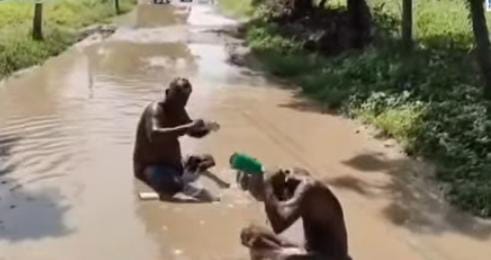 இந்நிலையில் இதனை மாவட்ட நிர்வாகத்திற்கு தெரிவிக்க வேண்டி வித்தியாசமான முறையில் இரண்டு முதியவர்கள் தண்ணீர் நிரம்பிய சேதமடைந்த சாலையின் மத்தியில் அமர்ந்து குளித்தனர்.