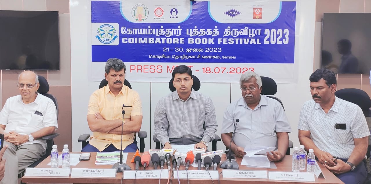 கோயம்புத்தூர் மாவட்ட சிறு தொழில்கள் சங்கம் எனும் கொடிசியா சார்பாக ஏழாவது ஆண்டாக கோயம்புத்தூர் புத்தகத் திருவிழா 2023 எனும் கண்காட்சி வரும் ஜூலை 21 ஆம் தேதி துவங்கி 30 ந்தேதி வரை நடைபெற உள்ளது..இந்நிலையில் இது குறித்த செய்தியாளர்கள் சந்திப்பு கொடிசியா அலுவலகத்தில் நடைபெற்றது.