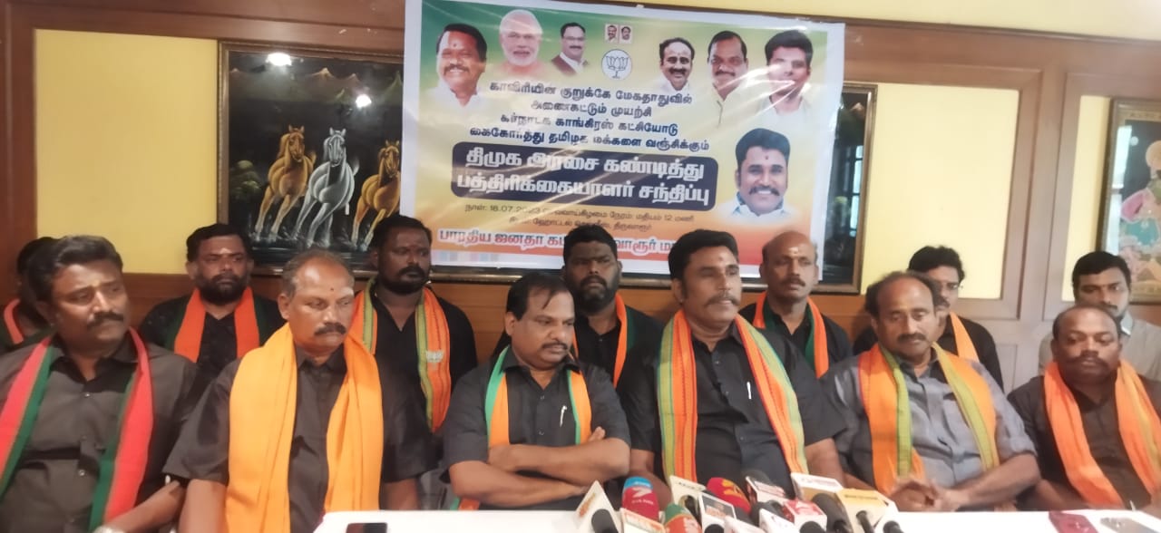 திருவாரூர் பழைய பேருந்து நிலையம் அருகே உள்ள ஹோட்டல் செல்விஸ். தனியார் கூட்டரங்கில் பாரதியஜனதா கட்சியின் சார்பில் காவிரியின் குறுக்கே மேகதாது அணை கட்டும் முயற்சியில் கர்நாடக காங்கிரஸ் கட்சியோடு கைகோர்த்து மக்களை வஞ்சிக்கும் திராவிட முன்னேற்ற கழக அரசை கண்டிப்பதாக கூறி பாஜக நிர்வாகிகள் கருப்பு சட்டை அணிந்து பத்திரிக்கையாளர் சந்திப்பில் கலந்து கொண்டனர்.