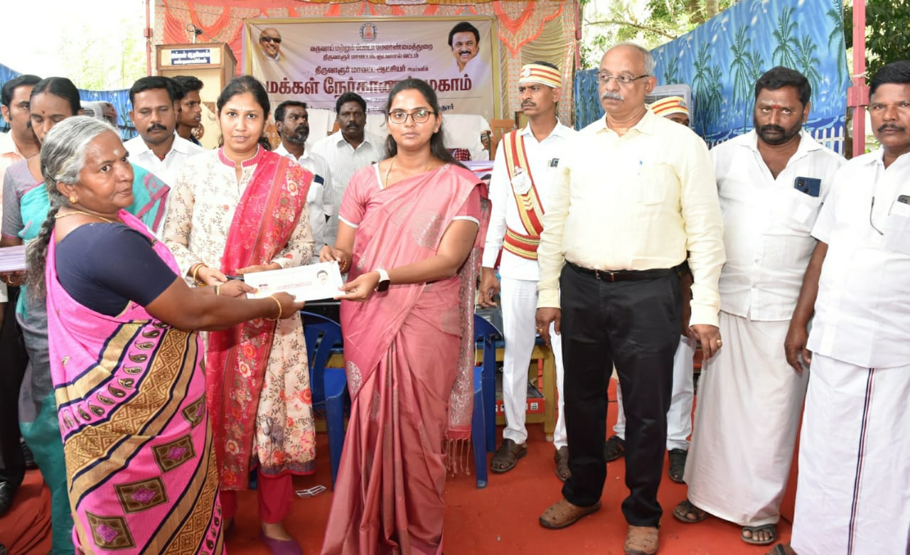 மக்கள் நேர்காணல் முகாமில் ஆதிதிராவிடர் நலத்துறையின் சார்பில் 4 நபர்களுக்கு இலவச தையல் இயந்திரமும், வேளாண்மைத்துறையின் சார்பில் 5 நபர்களுக்கு குறுவை தொகுப்பு, விவசாய உபகரணங்கள், நெல் நூண்ணூட்டம் உயிர் உரம் உள்ளிட்ட இடுப்பொருட்களும், தோட்டக்கலைத்துறையின் சார்பில் 5 நபர்களுக்கு காய், கனிக்கன்றுகளும், சமூக பாதுகாப்புத் திட்டத்தின் சார்பில் 57 நபர்களுக்கு முதியோர் உதவித்தொகைக்கான ஆணையும், வருவாய்த்துறையின் சார்பில் 40 நபர்களுக்கு இலவச வீட்டு மனைப்பட்டாவிற்கான ஆணையும், வட்ட வழங்கல் துறை சார்பில் 14 நபர்களுக்கு புதிய மின்னணு குடும்ப அட்டையும் என 125 பயனாளிகளுக்கு ரூ.14 இலட்சத்து 75 ஆயிரம் மதிப்பிலான நலத்திட்ட உதவிகள் வழங்கப்படுகிறது என மாவட்ட ஆட்சித்தலைவர் தி.சாருஸ்ரீ தெரிவித்தார்.