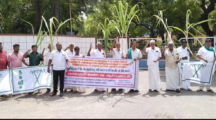 மத்திய பாஜக அரசு 2023- 24 பருவத்திற்கு 10. 25 சதவீதம் பிழித்திறன் கரும்புக்கு டன் ஒன்றுக்கு ரூ 3150 அறிவித்ததை கண்டித்தும்9.5 சதவீதம் பிழித்திறன் கரும்புக்கு டன் ஒன்றுக்கு ரூ 5000 வழங்கிட கோரியும்தமிழ்நாடு கரும்பு விவசாயிகள் சங்கம் இன்று நாமக்கல் மாவட்டம் மோகனூரில் உள்ள சேலம் கூட்டுறவு சர்க்கரை ஆலை முன்பு கண்டன ஆர்ப்பாட்டம் நடத்தினார்கள்.