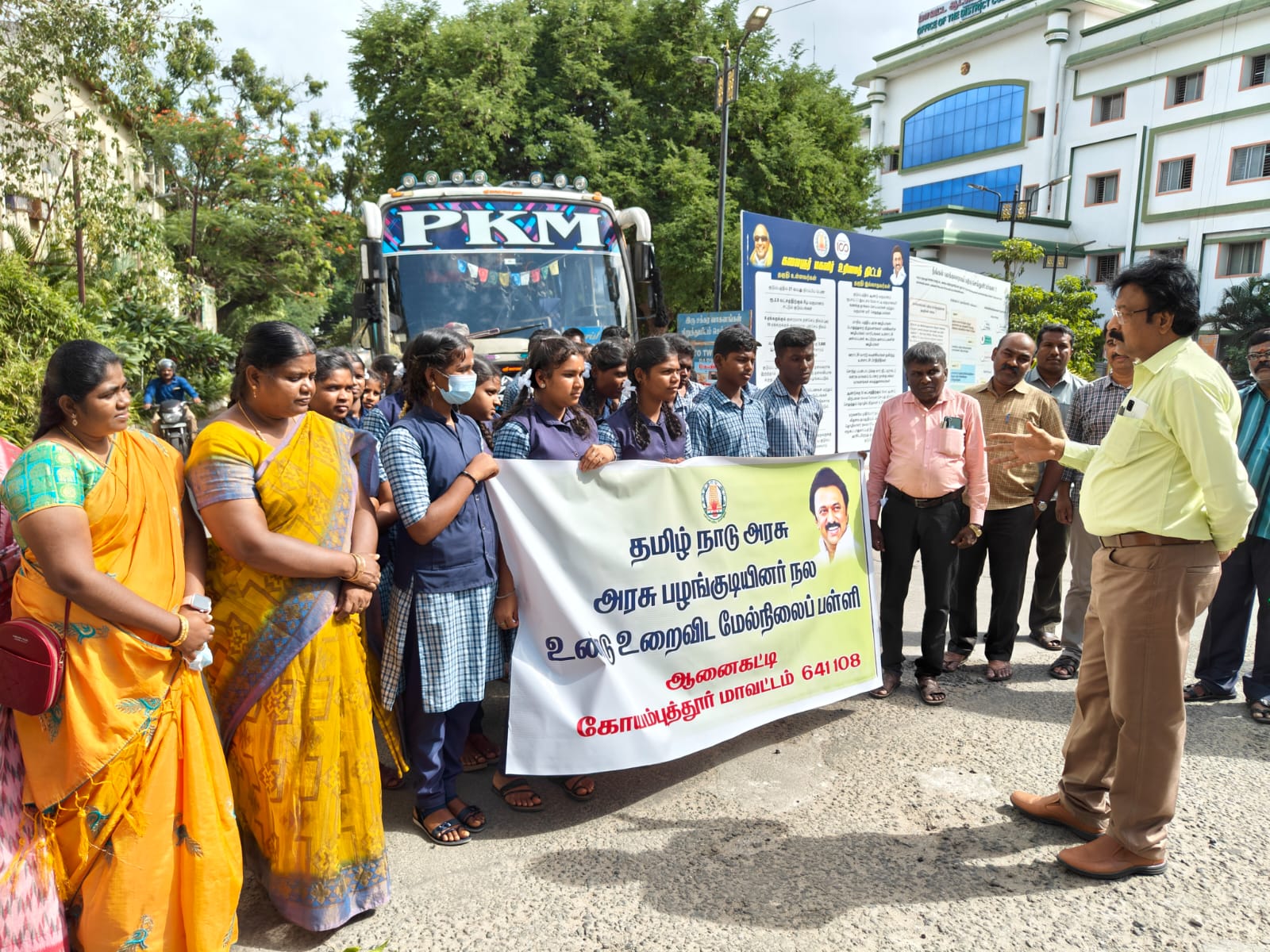 மாநில அளவிலான நடக்கவிருக்கும் பயிற்சியில் கலந்து கொள்வதற்காக கோவை ஆணைகட்டி அரசு உண்டு உறைவிட பள்ளியில் பயிலும் மாணவ மாணவிகள் 44 பேர் 6 ஆசிரியர்கள் மற்றும் தலைமை ஆசிரியருடன் மாவட்ட ஆட்சியர் வளாகத்தில் இருந்து வாகனத்தில் புறப்பட்டனர்.