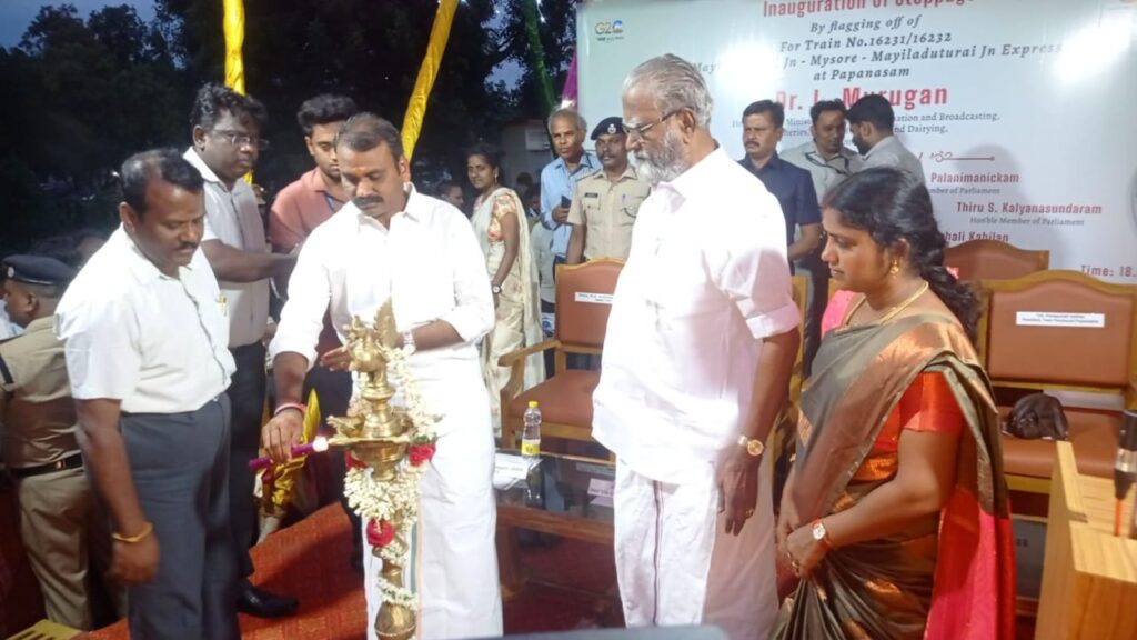 விழாவில் மத்திய தகவல் ஒளிபரப்பு, மீன்வளம் கால்நடை பராமரிப்பு மற்றும் பால்வளத்துறை இணை அமைச்சர் டாக்டர் எல். முருகன் கலந்து கொண்டு பாபநாசம் ரயில் நிலையத்தில் மயிலாடுதுறை மைசூர் இடையே இயக்கப்படும் விரைவு ரயில் நின்று செல்வதற்கான தொடக்க நிகழ்ச்சியை குத்துவிளக்கு ஏற்றி கொடியசைத்து துவங்கி வைத்து சிறப்புரையாற்றினார்.