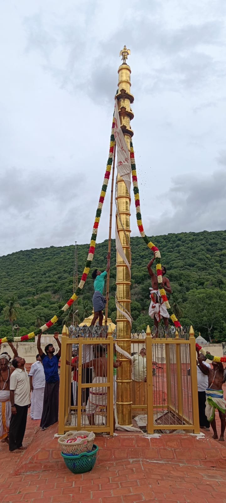 அதன்படி இந்த வருட திருவிழா நேற்று காலையில் மேளதாளம் முழங்க கொடியேற்றத்துடன் திருவிழா தொடங்கியது. இதில் அலங்கரிக்கப்பட்ட தங்க கொடிமரத்தை சுற்றிலும் நாணல் புல், மாவிலைகள், வண்ணபூ மாலைகள் இணைக்கபட்டு கருடன் உருவம் பொறித்த கொடி காலை 10.25மணிக்கு ஏற்றப்பட்டது.