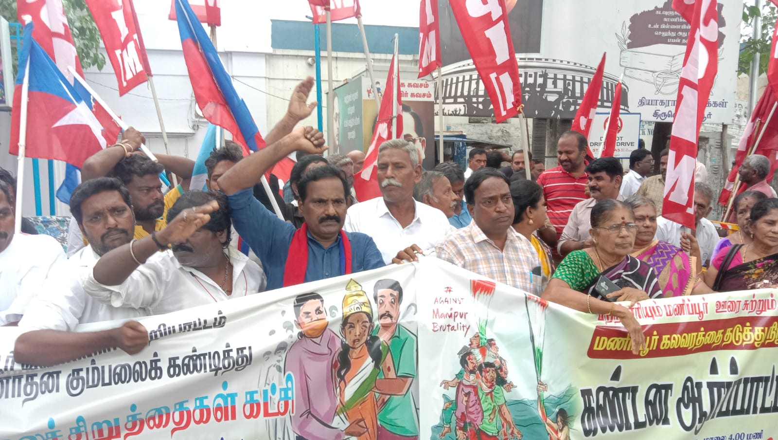 கடந்த 80 நாட்களாக நடைபெற்றுக் கொண்டிருக்கும் இனக் கலவரத்தை தடுப்பதற்கான எந்தவித நடவடிக்கையும் எடுக்காத மத்திய பாஜக அரசு மற்றும் மணிப்பூர் மாநில பாஜக முதல்வர் பைரவன்சிங் ஆகியோரை கண்டித்தும் மணிப்பூரில் அமைதி திரும்புவதற்கான ஏற்பாடை மேற்கொள்ள மாநில அரசை கலைத்து விட்டு ஜனாதிபதி ஆட்சி கொண்டுவர வேண்டும் என்ற கோரிக்கையை முன்வைத்து விடுதலை சிறுத்தைகள் கட்சி மற்றும் இந்திய மார்க்சிஸ்ட் கம்யூனிஸ்ட் கட்சி சார்பில் சென்னை திருவொற்றியூர் டோல்கேட் பேருந்து நிலையம் அருகே கண்டன ஆர்ப்பாட்டம் நடைபெற்றது.
