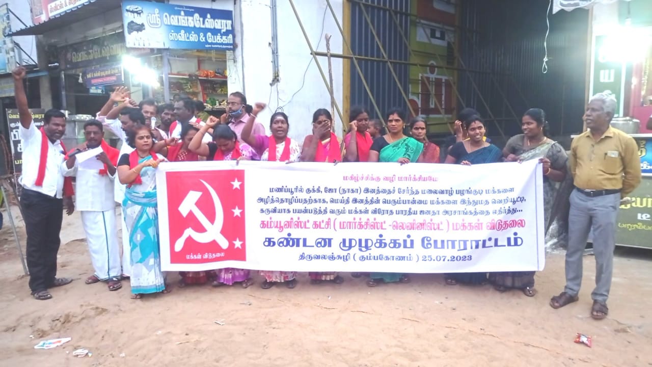 தஞ்சாவூர் மாவட்டம் கும்பகோணம் அருகே திருவலஞ்சுழி கடைவீதியில் மணிப்பூரில் குக்கி இனத்தை சேர்ந்த மலைவாழ் பழங்குடி மக்களை அழித்து ஒழிப்பதற்காக மெய்தி இனத்தின் பெரும்பாண்மை மக்களை இந்துமத வெறியூட்டி கருவியாக பயன்படுத்தி வரும் மக்கள் விரோத பாரதீய ஜனதா அரசாங்கத்தை எதிர்த்து சி.பி.எம்.எல். மக்கள் விடுதலை கட்சி சார்பில் கண்டன முழக்கப் போராட்டம் நடைப்பெற்றது.