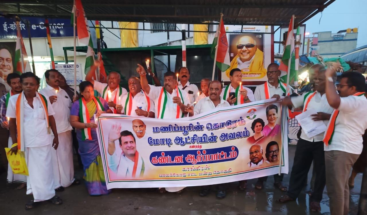 இந்த கண்டன ஆர்ப்பாட்டத்தில் மணிப்பூர் கலவரத்திற்க்கும், பெண்களை நிர்வாண படுத்தி துன்புறுத்தியதையும் கண்டித்து மெழுகுவர்த்தி ஏந்தி,பிரதமர் மோடிக்கு எதிராக கோஷங்கள் எழுப்பி கண்டன ஆர்ப்பாட்டத்தில் ஈடுபட்டனர்.