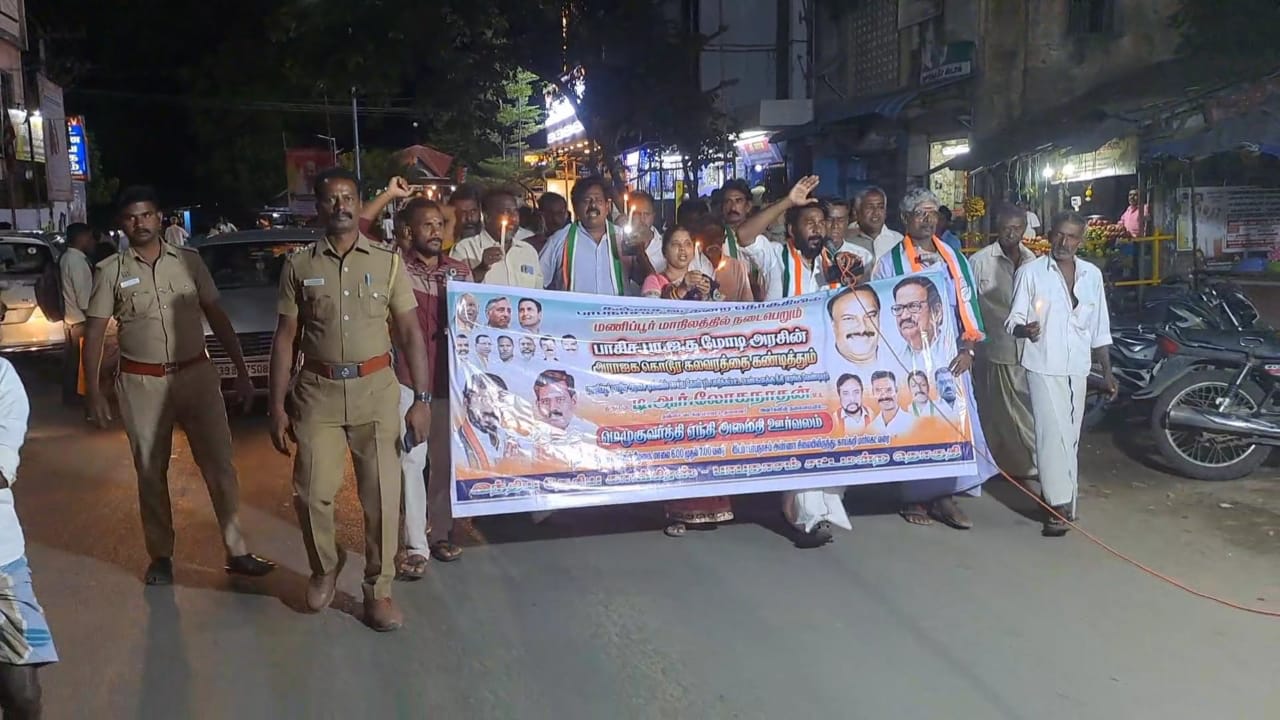 மணிப்பூர் பழங்குடியின சமூகத்தைச் சேர்ந்த இரண்டு பெண்கள் நிர்வாணமாக ஊர்வலமாக அழைத்துச் செல்லப்பட்டு பாலியல் வன்கொடுமை செய்யப்பட்ட சம்பவத்தை கண்டித்தும், மணிப்பூர் கலவரத்திற்கு மணிப்பூர் மாநில முதலமைச்சர் தார்மீக பொறுப்பேற்று பதவி விலக கோரியும் , பாதிக்கப்பட்ட பெண்களுக்கு நீதி வழங்க வேண்டியும் காங்கிரஸ் கட்சியினர் கையில் மெழுகுவர்த்தி ஏந்தி அமைதி ஊர்வலமாக அண்ணாசிலையில் தொடங்கி முக்கிய கடைவீதிகள் வழியாக சென்று நிறைவடைந்தது.