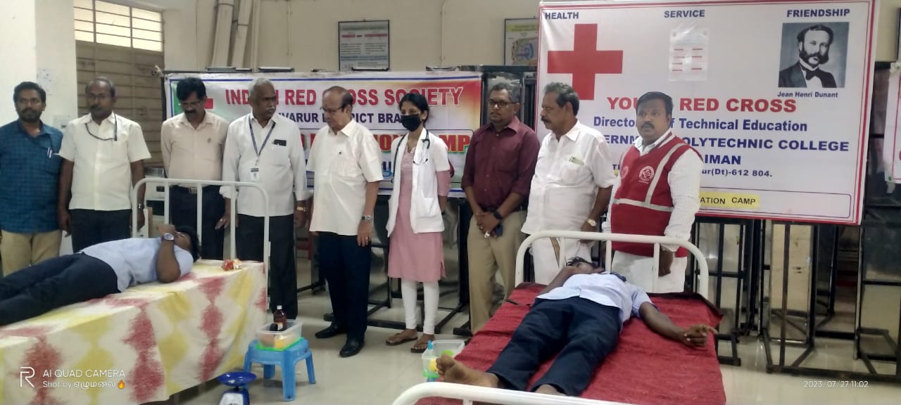 பாரதிதாசன் பல்கலைக்கழக மான்பமைத் துணை வேந்தர் முனைவர் செல்வம் அவர்களின் வழிகாட்டுதலின் படியும், பாரதிதாசன் பல்கலைக்கழக யூத் ரெட் கிராஸ் மண்டல ஒருங்கிணைப்பாளர் முனைவர் வெற்றி வேல் அவர்களின் ஆலோசனைப் படியும், திருவாரூர் மாவட்டம், வலங்கைமான் வட்டம், தொழுவூரில் உள்ள அரசினர் பலவகை தொழில்நுட்பக் கல்லூரியின் யூத் ரெட் கிராஸ் சொசைட்டி யின் சார்பாக , மாவட்ட இந்தியன் ரெட் கிராஸ் சொசைட்டி மற்றும் திருவாரூர் மாவட்ட அரசினர் மருத்துவக் கல்லூரி மருத்துவமனையுடன் இணைந்து மாபெரும் இரத்ததான முகாம் அக்கல்லூரியின் கலை அரங்கத்தில் நடைப்பெற்றது.