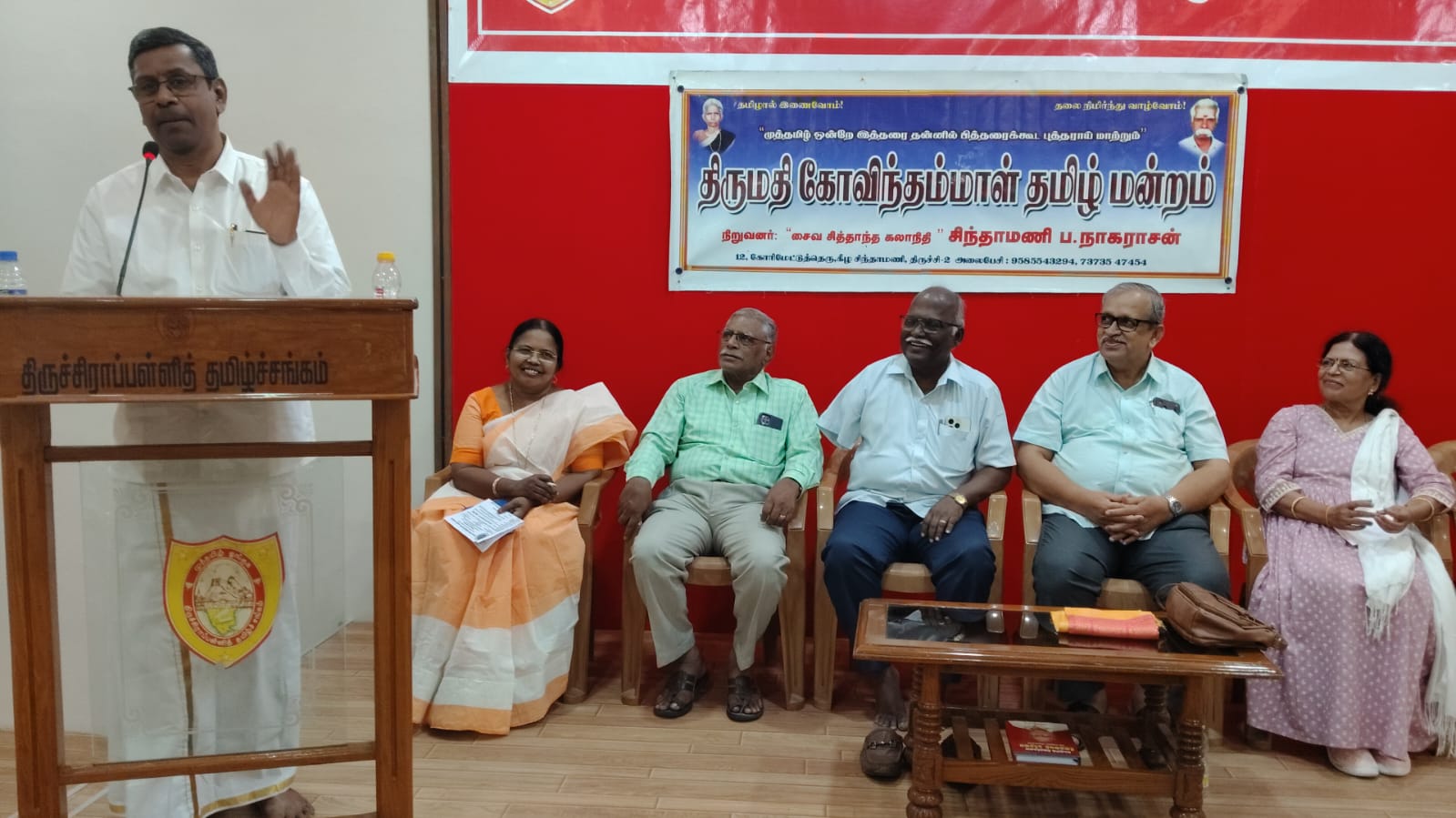 திருமதி கோவிந்தம்மாள் தமிழ் மன்றம் சார்பில் டிசம்பர் மாத முதல் கூட்ட நிகழ்வில் என்ன பேசுவது எப்படி பேசுவது குறித்த சிறப்பு சொற்பொழிவு நிகழ்ச்சி திருச்சி தமிழ்ச் சங்கம் குளிர்மை அரங்கில் நடைபெற்றது. திருமதி கோவிந்தம்மாள் தமிழ் மன்ற தலைவர் தமிழ்ச்செம்மல் கோவிந்தசாமி ,விழா குழு தலைவர் வைகுண்ட மூர்த்தி உள்ளிட்டோர் தலைமை வகித்தனர்.