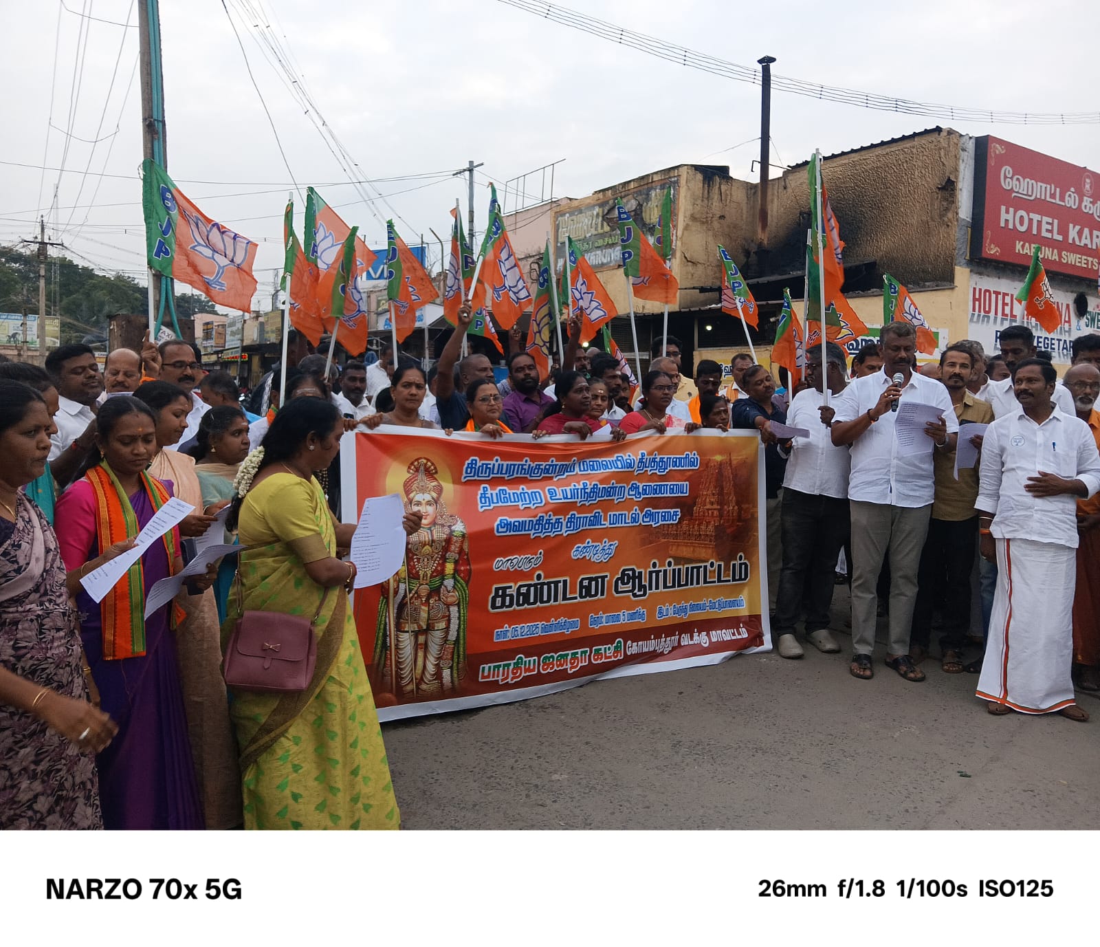 கோவை மாவட்டம் மேட்டுப்பாளையத்தில் திருப்பரங்குன்றம் விவகாரத்தை கண்டித்து பாரதிய ஜனதா கட்சியினர் ஆர்ப்பாட்டத்தில் ஈடுபட்டனர்