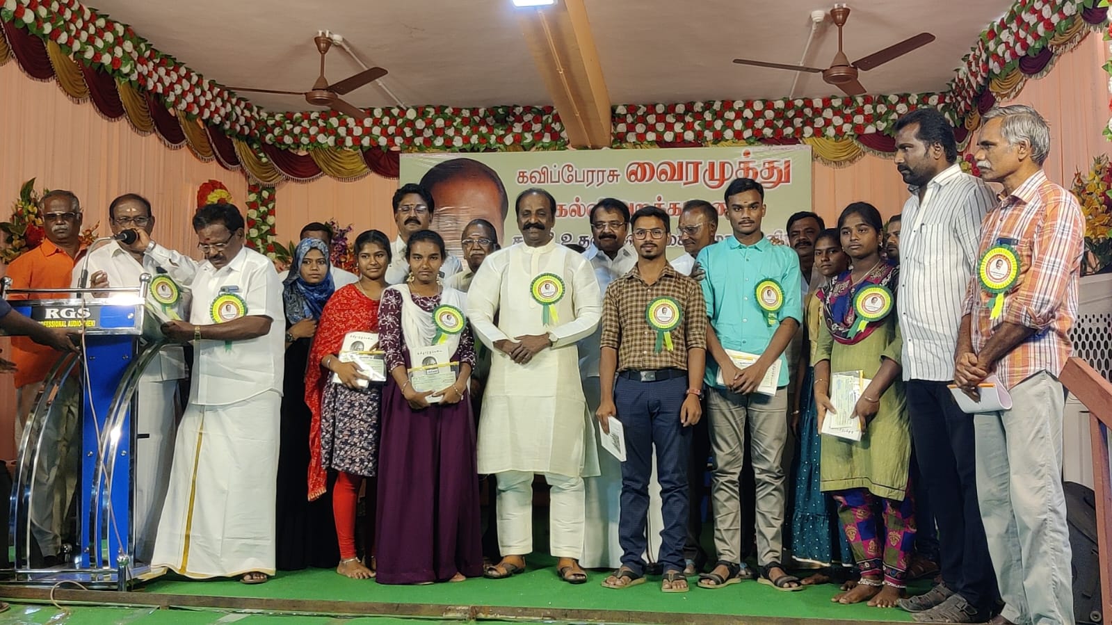 இதில் பங்கேற்ற கவிப்பேரரசு வைரமுத்து தேனி மாவட்டத்தில் உள்ள அரசு பள்ளியில் தமிழ் வழிகல்வியில் 12ஆம் வகுப்பு முடித்த ஓரளவிற்கு நல்ல மதிப்பெண்களை எடுத்து ஏழ்மைநிலையால் கல்லூரி படிப்பை தொடர முடியாமல் உள்ள மாணவ மாணவிகளுக்கு கல்வி உதவித்தொகை வழங்கி வருகின்றார்.
