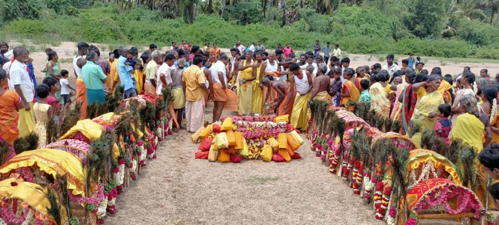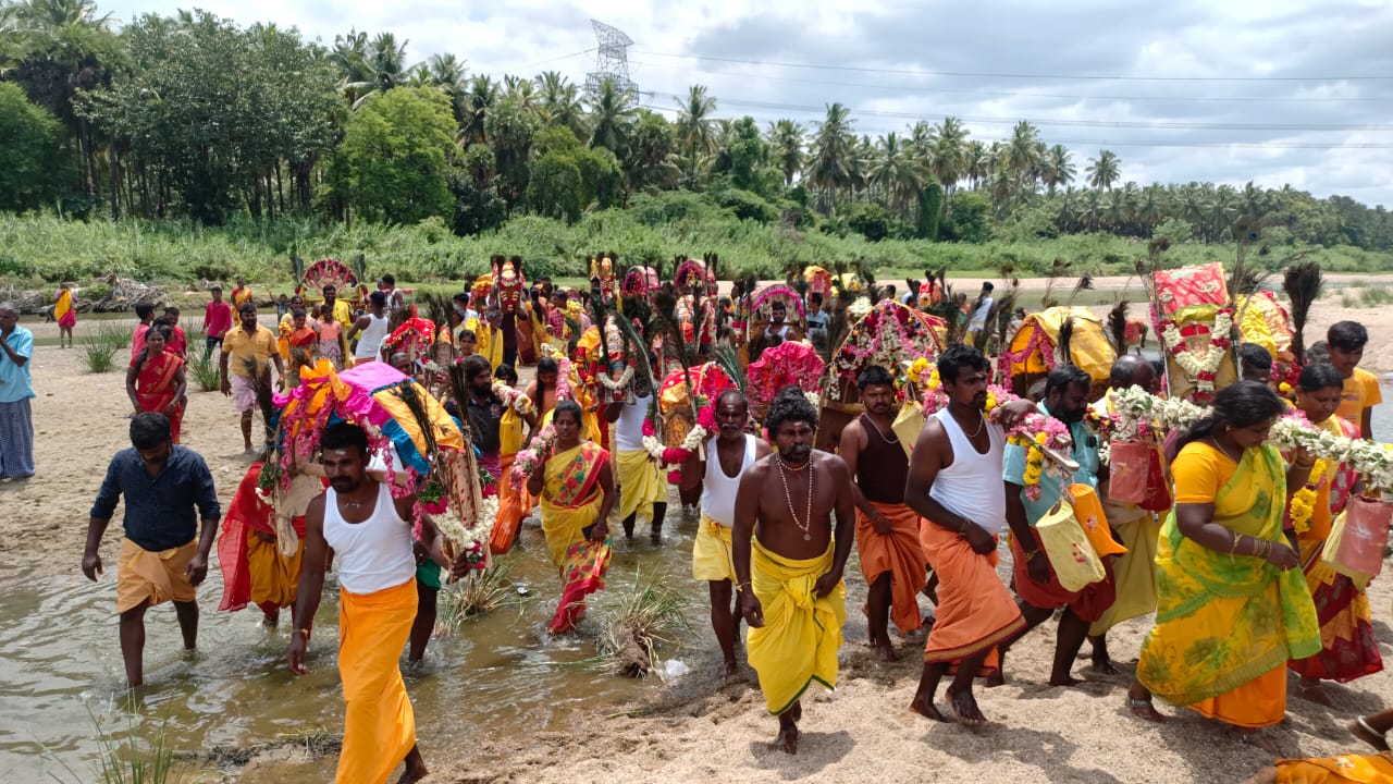 அந்தவகையில் 250ற்கும் மேற்பட்ட கிராம மக்கள் தெண்பெண்னை ஆற்றில் குளித்துவிட்டு, புங்கம்பட்டி கிராமத்தில் உள்ள மாரியம்மன் கோவிலில் தங்கி இரவு பேருந்து மூலம் திருத்தனி செல்கின்றனர்.