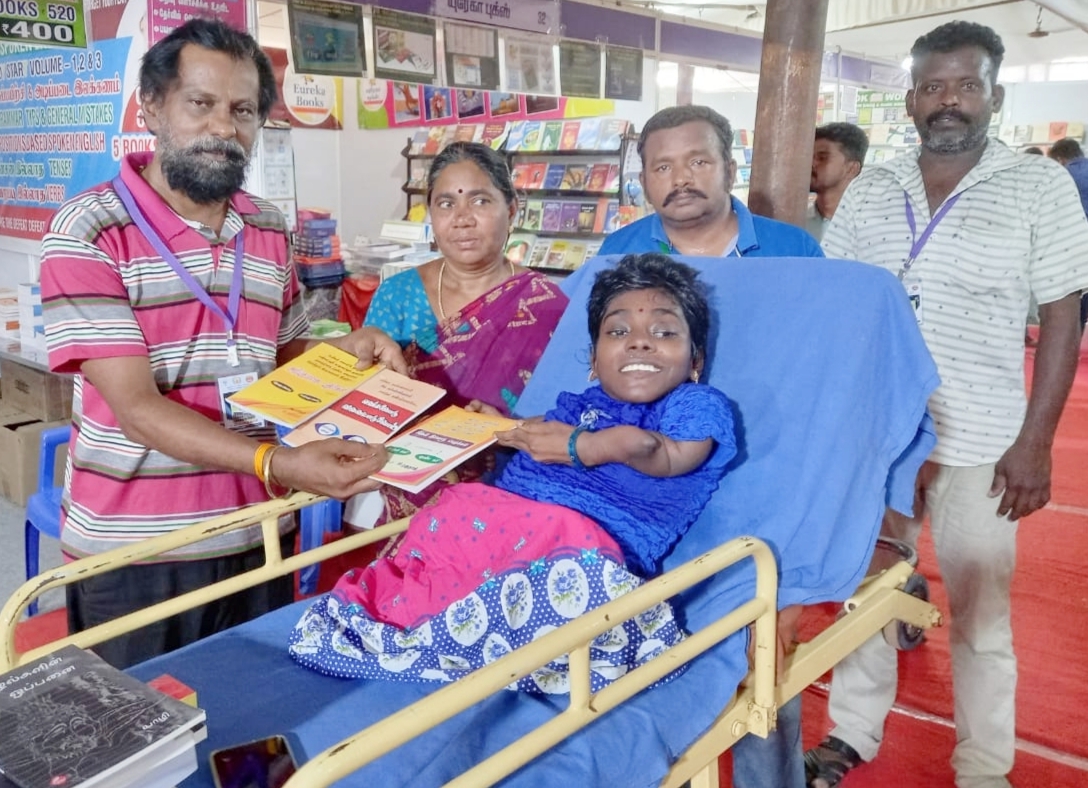 புதுக்கோட்டை புத்தகத் திருவிழாவில் கந்தர்வகோட்டை அருகே உள்ள கொத்தம்பட்டியை சேர்ந்த மாற்றுத்திறனாளி சுகுணா என்ற பெண்மணி ஆம்புலன்ஸ் மூலமாக வந்து ஒவ்வொரு ஸ்டாலிலும் பார்வையிட்டு புத்தக பதிப்பாளர்கள் இலவசமாக கொடுத்த புத்தகத்தையும், அர்த்தம் பதிப்பகம் மூலமாக குறும்பட இயக்குனரும், நடிகரும், தென்னிந்திய நடிகர் சங்க உறுப்பினரும், சமூக சேவகருமான சேவா ரத்னா டாக்டர் ஜெ.விக்டர் வழங்கினார். உடன் கிருபா மற்றும் பலர் உள்ளனர்.