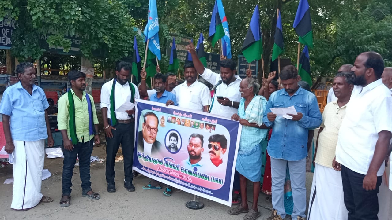 ஆர்ப்பாட்டத்தில் தாயக மக்கள் கட்சி மாநிலத் தலைவர் தமிழ்செல்வன், மண்டல செயலாளர் தீனா, மாவட்ட செயலாளர் திருமாவளவன், ஆதித்தமிழர் பேரவை மாவட்ட செயலாளர் முருகன் மற்றும் இந்திய மூல நிவாசி காவல் படையினர் 50க்கும் மேற்பட்டோர் கலந்து கொண்டனர்.