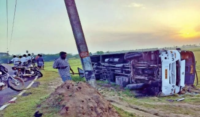 செய்யாறு அருகே இன்று அதிகாலை தனியார் கம்பெனி பஸ் கவிழ்ந்தது.இதில் 22 தொழிலாளர்கள் படுகாயமடைந்தனர்.