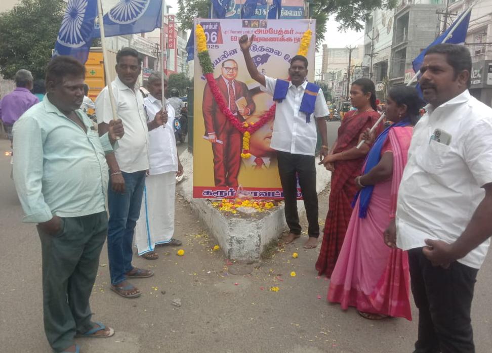 கரூரில் கரூர் மாநகர் பஸ் நிலையம் ரவுண்டானா அருகில் அமைந்துள்ள காமராஜர் சிலை முன்பு சட்ட மேதை டாக்டர் அம்பேத்காரின் 69வது வீரவணக்க நாளை முன்னிட்டு பட்டியலின விடுதலைப் பேரவை சார்பில் மாநில நிறுவன தலைவர் தலித் ஆனந்தராஜ் தலைமையில் மாலை அணிவித்து,மலர் தூவி வீரவணக்கம் செலுத்தினார்.