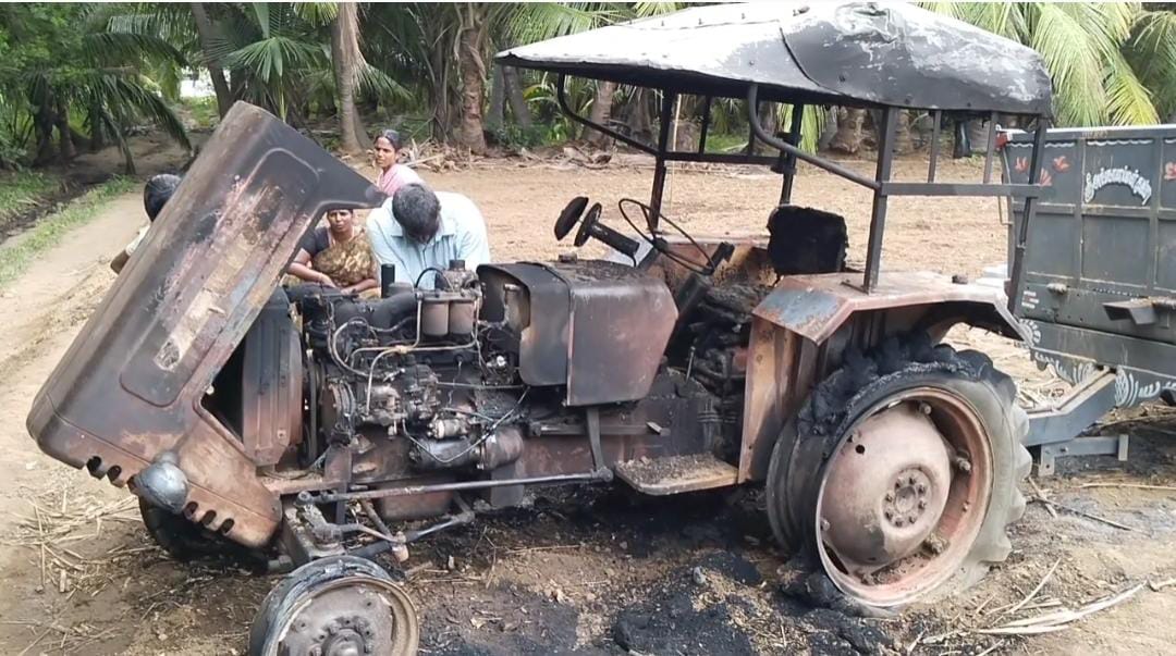 நாமக்கல் மாவட்டம் பரமத்தி வேலூர் அடுத்துள்ள ஜேடர்பாளையம் அருகே உள்ள வடக்கு தோட்டம் பகுதியைச் சேர்ந்தவர் கருப்பண்ணன் மகன் சுப்பிரமணியம் இவரது விவசாயத் தோட்டத்தில் நிறுத்தி வைக்கப்பட்டிருந்த விவசாய டிராக்டர் வண்டிக்கு று அதிகாலை 3 மணியளவில் மர்ம நபர்கள் தீ வைத்துள்ளனர்