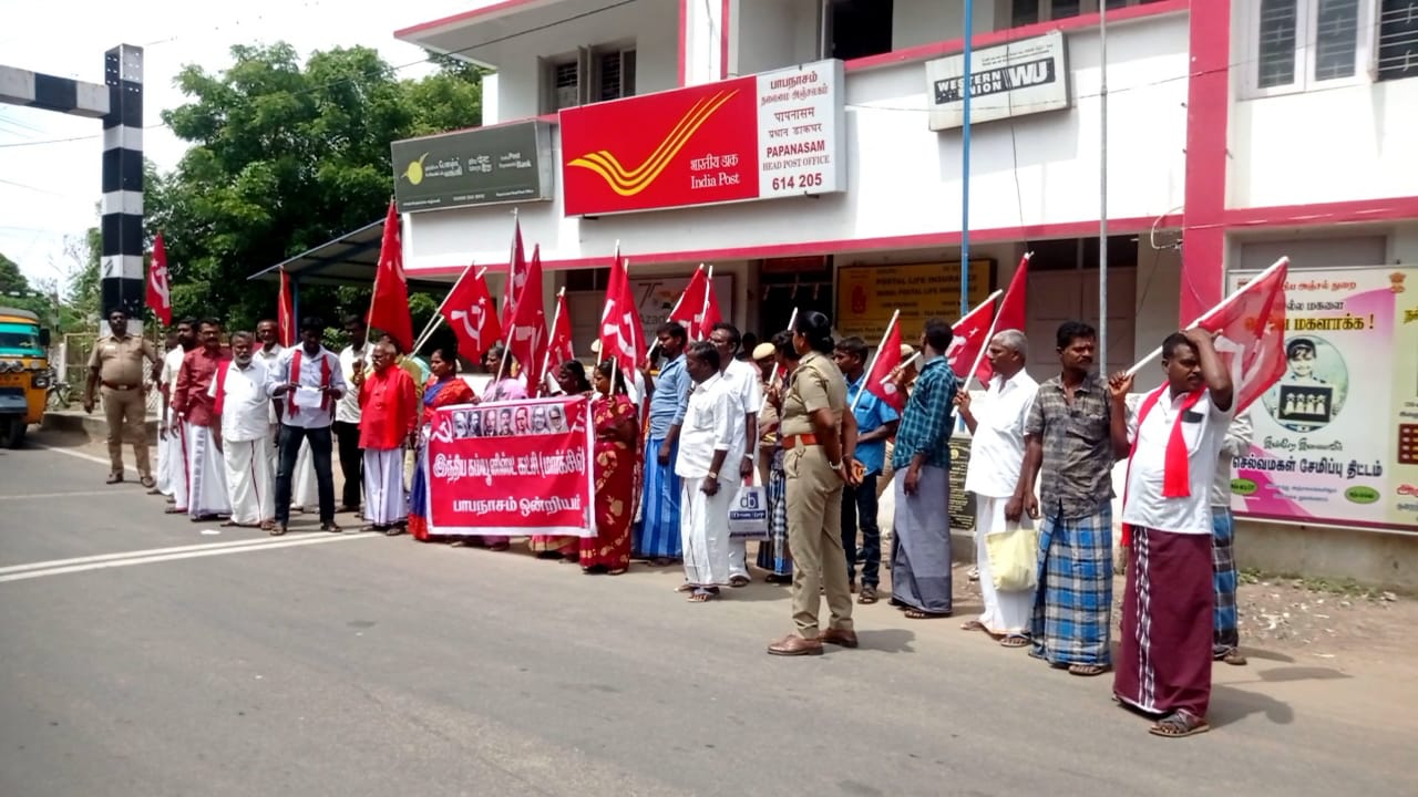 இதன் ஒரு பகுதியாக பாபநாசம் ரயில் நிலையம் அருகே அமைந்துள்ள தலைமை தபால் நிலையம் முன்பு ஒன்றிய செயலாளர் முரளிதரன் தலைமையில், விலைவாசி உயர்வு மற்றும் அதிகரித்து வரும் வேலையின்மை காரணமான மோடி அரசை கண்டிப்பதாக கூறி, கைகளில் கொடிகளை ஏந்தி, மத்திய அரசுக்கு எதிராக கோஷங்கள் இட்டவாறு பல்வேறு கோரிக்கைகளை வலியுறுத்தி, மார்க்சிஸ்ட் கம்யூனிஸ்ட் கட்சியினர் மறியல் போராட்டத்தில் ஈடுபட்டனர். போராட்டத்தில் ஈடுபட்டவர்களை கைது செய்த பாபநாசம் போலீசார் தனியார் திருமண மண்டபத்தில் தங்க வைத்தனர்.
