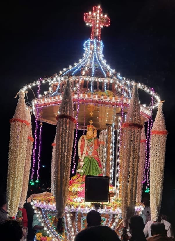இரவு 7மணிக்கு வண்ணவிளக்குகள் மல்லிகை.மலர்களால் அலங்கரிக்கப்பட்ட. தேரில் பச்சைபட்டுடுத்தி ஆரோக்கியஅன்னை அருள் பாலித்தார். இந்த தேர்பவனி திருத்தலத்திலிருந்து புறப்பட்டு மகாராணிநகர், குலசேகரன்கோட்டைபிரிவு, இராமநாயக்கன்பட்டி, சந்தைபாலம், பேட்டைதலைவாசல், லாலாபஜார், பஸ்நிலையம் ஜெமினிபூங்கா, யூனியன்ஆபிஸ்பிரிவு, பழையநீதிமன்றம் சென்று மீண்டும் மதுரை திண்டுக்கல் சாலை வழியில் திருத்தலம் அடைந்தது.
