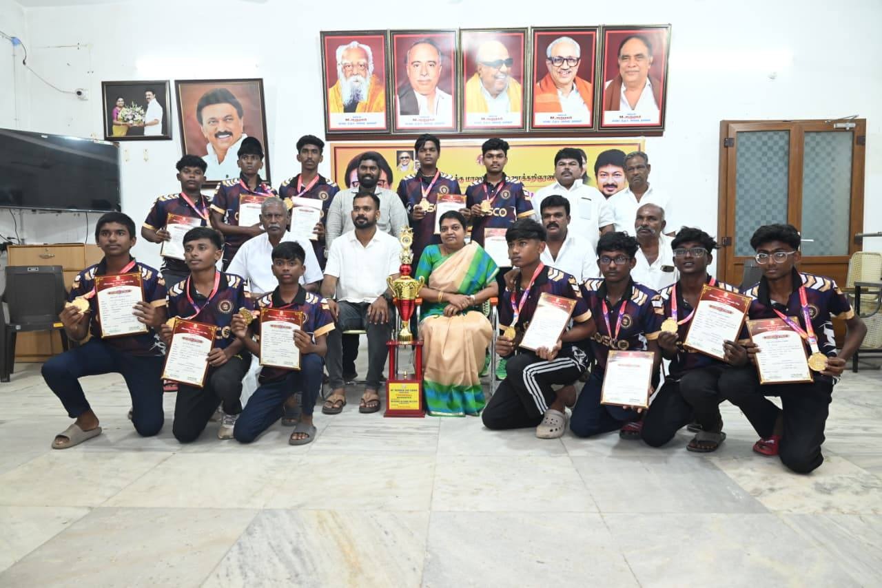 தூத்துக்குடியில் மாவட்ட அளவிலான எரிபந்தாட்ட போட்டியில் வெற்றி பெற்ற மாணவா்கள் அமைச்சா் கீதாஜீவனிடம் வாழ்த்து பெற்றனா்.